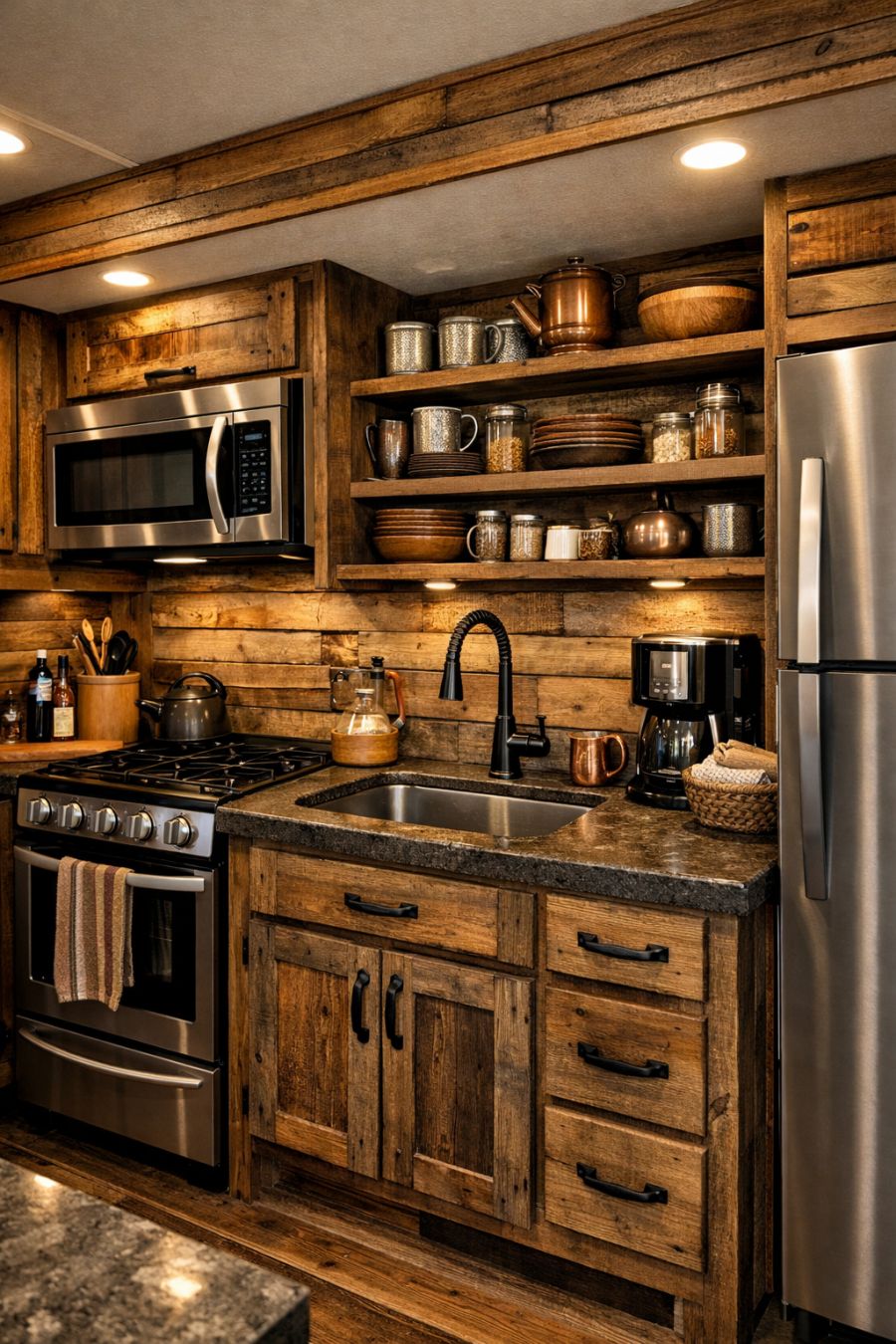 Living in this RV offers a unique opportunity to experience the best of both worlds: the freedom of a mobile lifestyle and the comfort of a luxurious, rustic retreat. It's ideal for those who crave adventure and the thrill of exploring new places, but also value the tranquility and warmth of a home rooted in nature. The thoughtful design ensures that you never have to compromise on comfort, providing a haven that feels far removed from the demands of modern life. Whether you're parked by a serene lake, deep within a forest, or at a bustling RV park, this home ensures that you always have a peaceful retreat to return to.