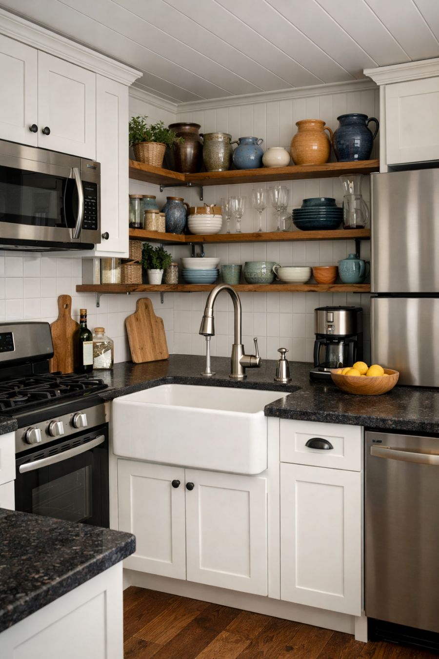 In the kitchen, functionality meets style with a layout that maximizes space and efficiency. Crisp white cabinetry contrasts beautifully with the dark granite countertops, providing ample room for meal preparation. A farmhouse sink and brushed nickel fixtures add a touch of vintage charm, while state-of-the-art appliances ensure modern convenience. Open shelving displays an array of artisanal pottery and glassware, adding personality and color to the space. The kitchen is designed to be both practical and delightful, catering to the culinary enthusiast.