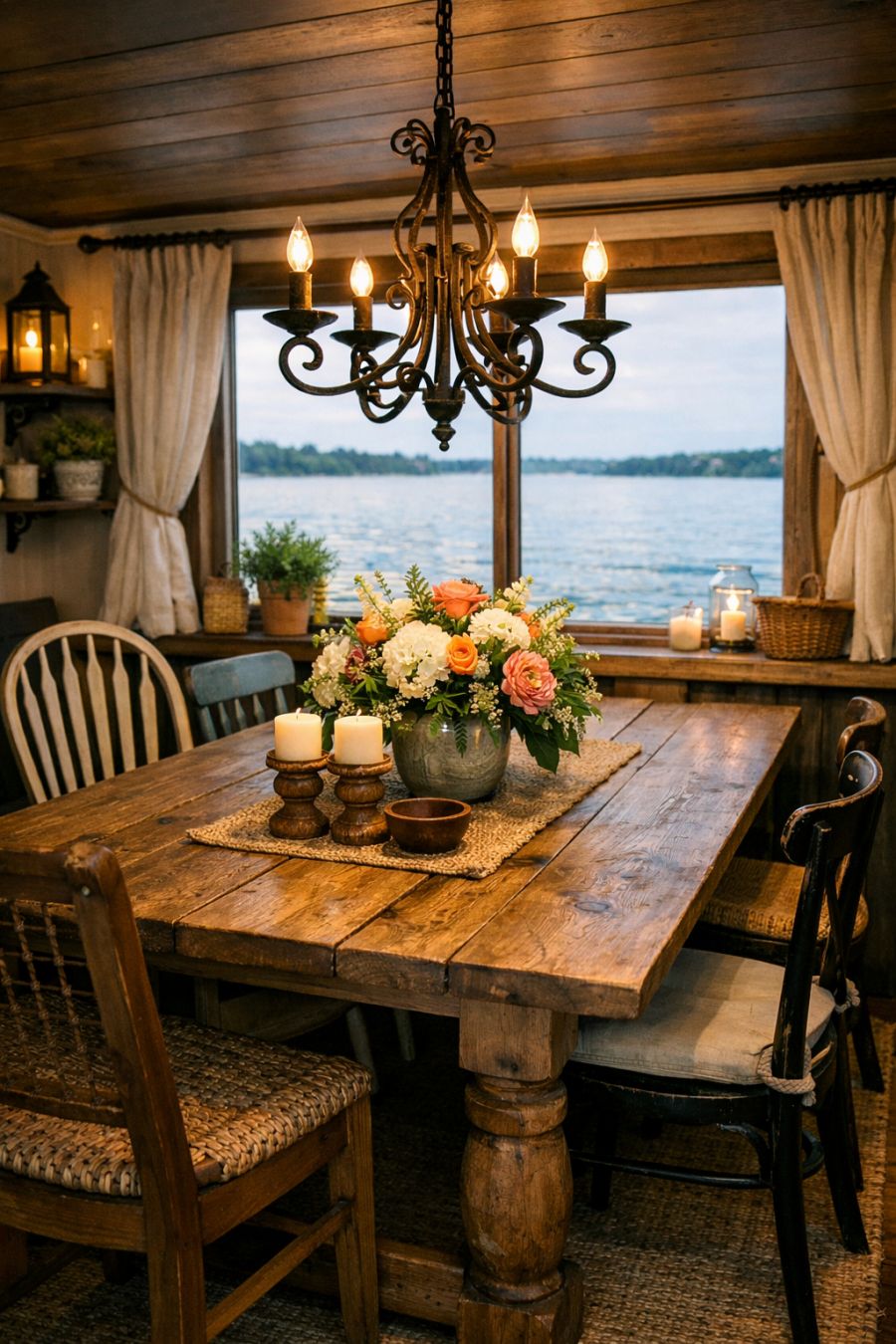 The dining area is a perfect blend of rustic charm and modern elegance, featuring a wooden farmhouse table that comfortably seats six. Above, a wrought-iron chandelier casts a warm glow, creating an inviting atmosphere for intimate dinners or lively gatherings. Surrounding the table, mismatched chairs add a touch of whimsy and character, while a large window offers picturesque views of the water. Natural elements are woven throughout the design, with a centerpiece of fresh flowers and wooden accents bringing the beauty of the outdoors in.