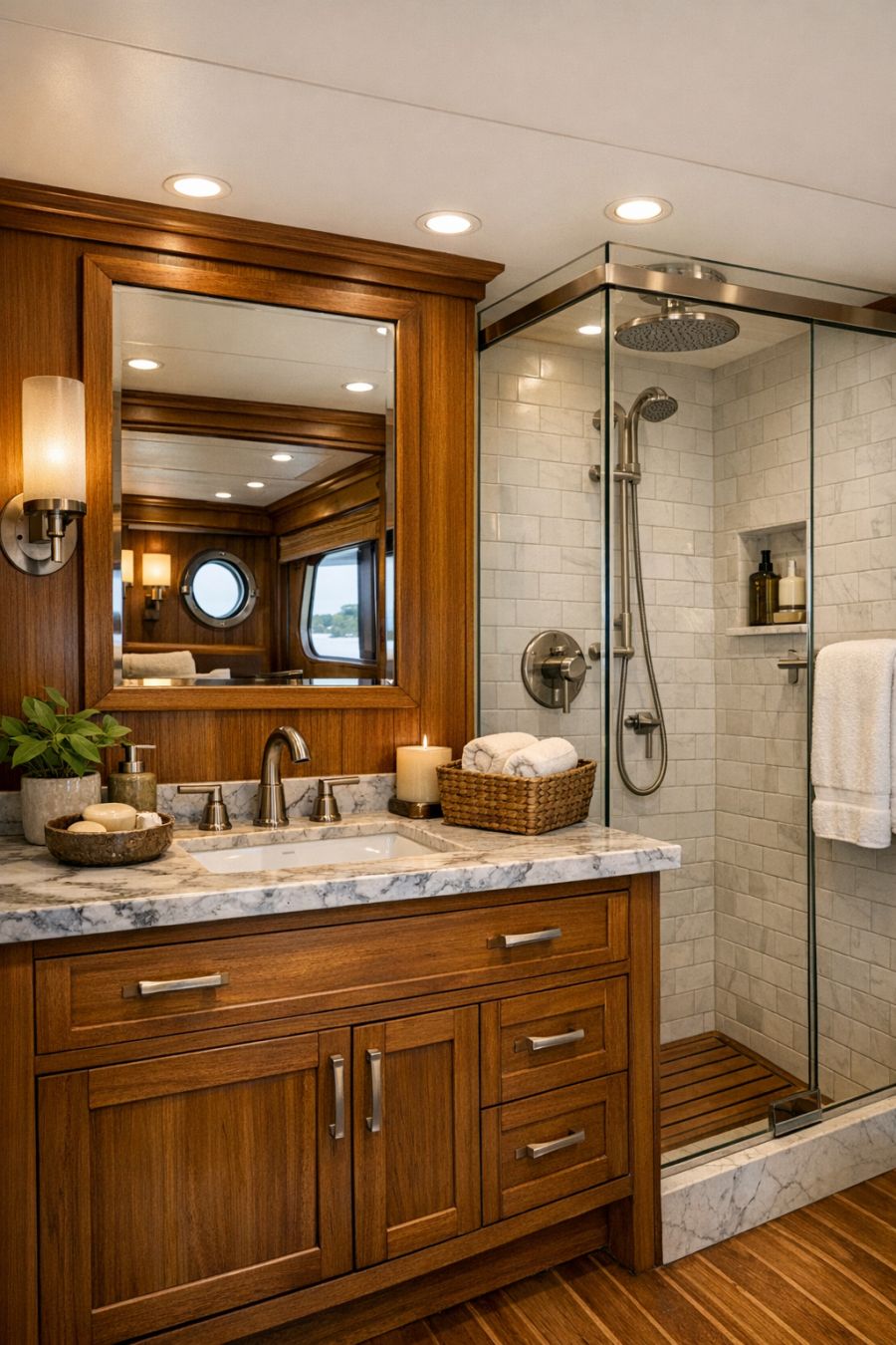 The bathroom exudes a sense of spa-like tranquility, with its use of natural materials and soothing color schemes. A beautifully crafted wooden vanity topped with a polished marble countertop offers both style and functionality. The glass-enclosed shower is spacious, featuring elegant white subway tiles and a rain showerhead for a luxurious experience. Soft, ambient lighting and well-placed mirrors enhance the feeling of space, while carefully selected fixtures add a contemporary touch. Every element is designed to create a refreshing and rejuvenating environment.