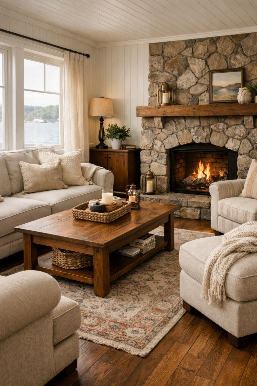 Step inside the living area and you'll be embraced by an atmosphere of cozy sophistication. The space is adorned with soft, neutral-toned fabrics and plush seating arrangements that invite you to unwind. A vintage-inspired area rug anchors the room, complementing the polished hardwood floors that stretch throughout the houseboat. Natural light pours in through large windows, highlighting the subtle cottage-style details, such as beadboard paneling and a charming stone fireplace that serves as the room's focal point.