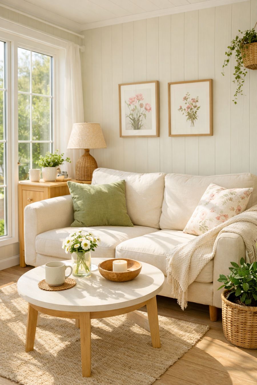 Stepping inside, the living area is a masterpiece of cozy elegance, bathed in natural sunlight streaming through expansive sunroom windows. The walls are painted in soft pastel hues, complementing the light wooden flooring that adds warmth and a homely feel. A plush, cream-colored sofa sits invitingly near a small, round coffee table, offering a perfect spot for relaxation or entertaining guests. The decor is minimal yet charming, with potted plants and delicate floral prints adorning the space, reinforcing the home's springtime theme.