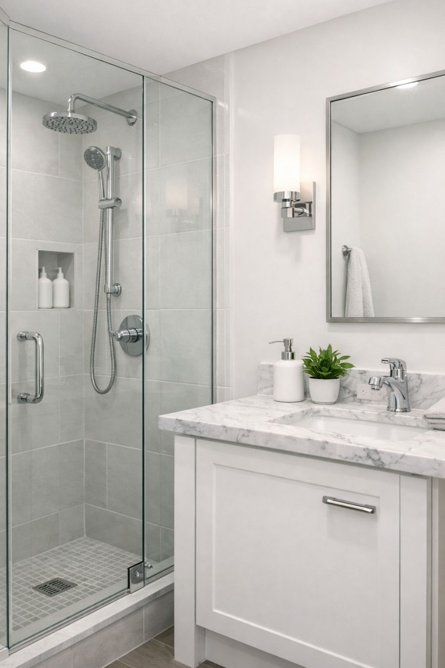The bathroom is a study in modern simplicity, featuring clean lines and a calming color palette of whites and soft greys. The shower area is enclosed with clear glass, maximizing space and allowing light to flow freely. Polished chrome fixtures add a touch of sophistication, while a small vanity with a marble countertop provides both style and functionality. The room is completed with subtle touches of greenery, like a small potted plant, which brings a hint of nature indoors, enhancing the overall tranquil atmosphere.