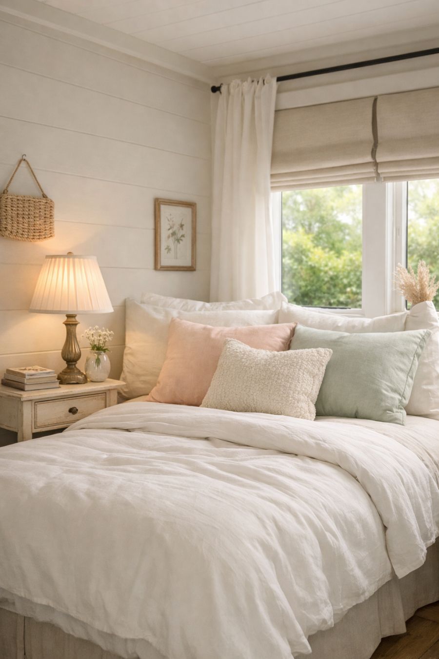 The bedroom is a serene retreat, designed to be a haven of rest and relaxation. Soft, neutral tones dominate the space, with a plush bed dressed in crisp white linens and a selection of pastel throw pillows. A small, vintage-style nightstand holds a delicate lamp, providing ambient lighting for nighttime reading. Large windows allow the morning light to gently awaken the room, while blackout blinds ensure a restful night's sleep. The decor is simple yet elegant, with a few carefully chosen pieces that add personality without overwhelming the peaceful vibe.