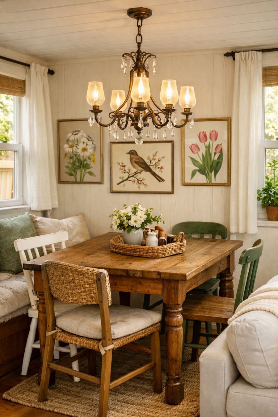 The dining area seamlessly integrates with the living space, featuring a quaint wooden table paired with mismatched chairs that add character and charm. A delicate chandelier hangs overhead, casting a gentle glow that enhances the intimate atmosphere. The walls are adorned with botanical art pieces, further tying in the spring theme and creating a cohesive aesthetic. Large windows ensure the space is always bright and airy, making it an inviting area to enjoy meals with family and friends.