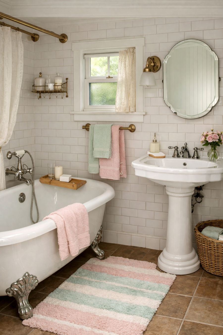 In the bathroom, the Victorian charm continues with a clawfoot tub standing elegantly as the centerpiece. The walls are tiled with white subway tiles, providing a clean and classic backdrop. A pedestal sink with vintage-style fixtures complements the tub, while a small window allows natural light to brighten the space. Pastel accents, such as the towels and bath mat, tie the room into the home's overall color scheme. Despite its compact size, the bathroom feels luxurious and inviting, offering a perfect blend of functionality and style.