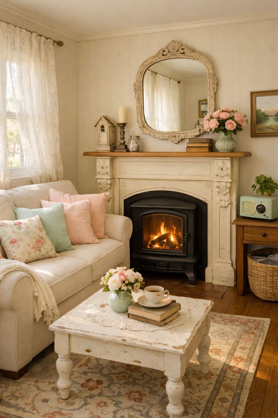 Step inside the living area, and you're greeted by a harmonious blend of vintage charm and modern comforts. The walls are painted in a soft pastel hue, creating a soothing and welcoming atmosphere. A plush, cream-colored sofa sits against one wall, adorned with pastel-colored throw pillows that echo the home's exterior palette. The room is illuminated by natural light filtering through lace curtains, casting delicate shadows that dance across the hardwood floors. A small, ornate fireplace serves as the focal point, perfect for cozy evenings.
