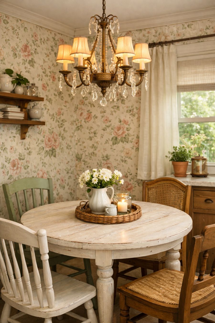 The dining area is a delightful blend of elegance and functionality, designed to make the most of the tiny home's compact space. A round, whitewashed table sits in the center, surrounded by mismatched chairs that add a touch of eclectic charm. Above the table hangs a vintage-inspired chandelier, casting a warm, inviting glow over the space. The walls are adorned with floral-patterned wallpaper, creating a seamless connection to the garden outside. Despite its size, the dining area feels open and airy, perfect for intimate dinners or morning coffee.
