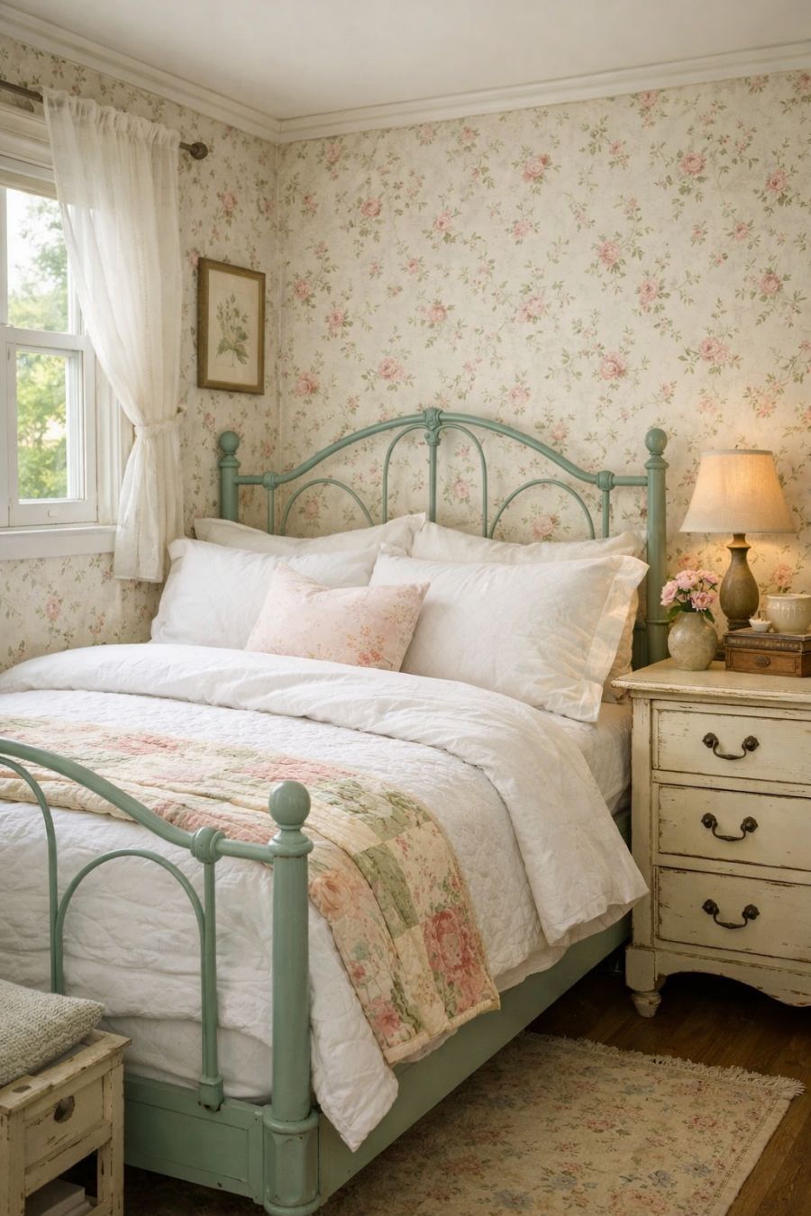 The bedroom is a serene sanctuary, designed with both comfort and aesthetics in mind. A wrought-iron bed frame, painted in a soft pastel shade, takes center stage, dressed in crisp white linens and a cozy quilt. The walls are adorned with delicate floral wallpaper, echoing the blooms outside and creating a restful retreat. Soft, sheer curtains frame the windows, allowing gentle light to filter in and illuminate the space. A vintage dresser adds character and functionality, offering ample storage while maintaining the room's timeless charm.