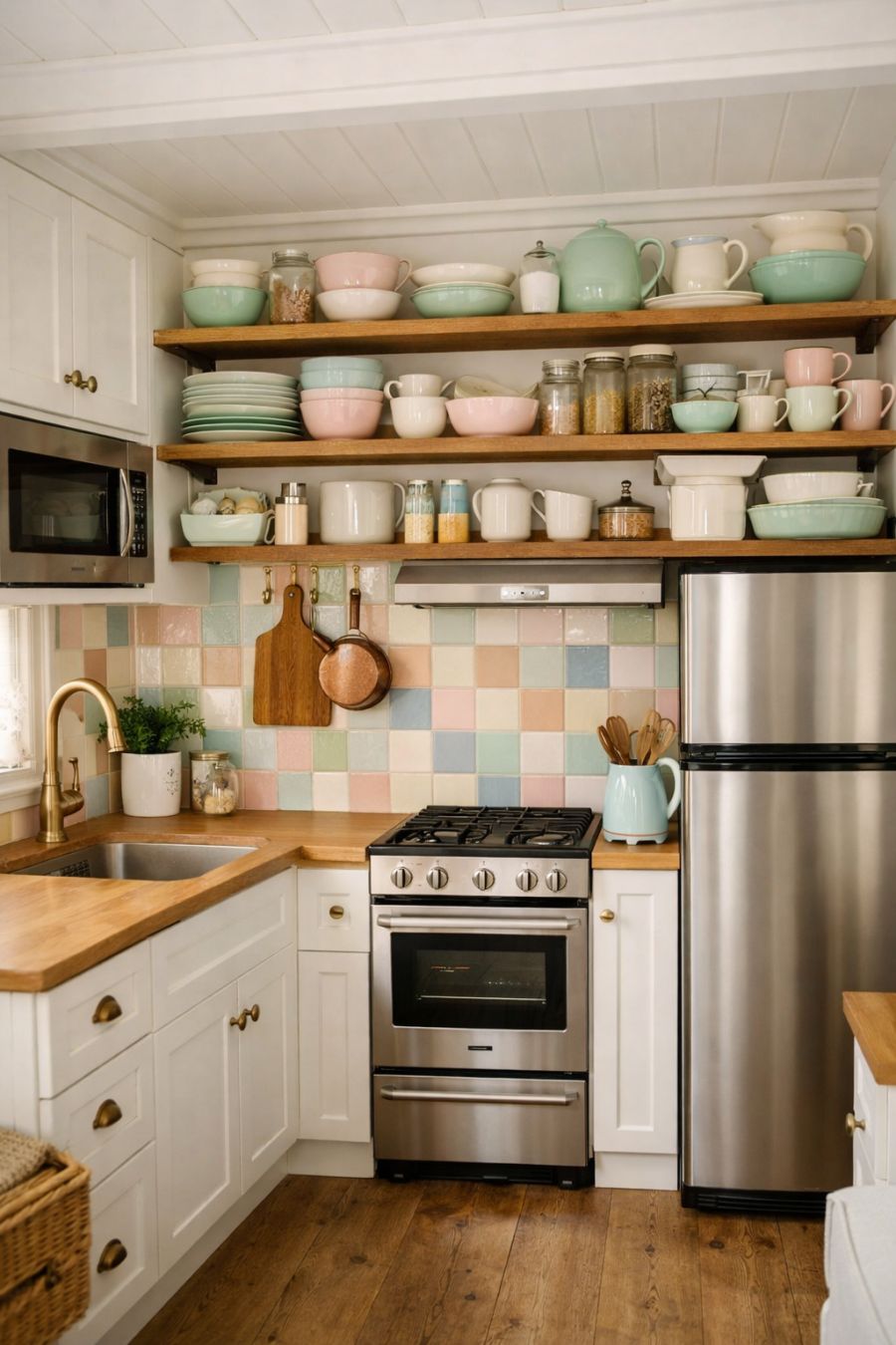 The kitchen area is a masterclass in maximizing space without sacrificing style. White cabinetry lines the walls, offering ample storage while maintaining a bright and open feel. A pastel-colored backsplash adds a pop of color, harmonizing beautifully with the overall theme of the home. Modern appliances are cleverly integrated, ensuring functionality without disrupting the vintage aesthetic. An open shelf displays a collection of pastel-hued dishware, adding a personal touch to the space and making it feel both practical and homey.