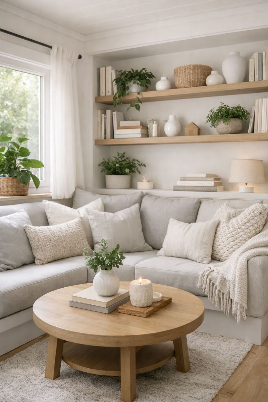 Step inside the living area, and you'll be greeted by an ambiance of understated elegance. The interior design is marked by a soothing palette of whites and soft grays, enhanced by the natural light streaming through large windows. A cozy seating area with plush cushions invites relaxation, while the carefully curated selection of plants adds a touch of the outside in. The craftsmanship is evident in the built-in shelving, which provides both functionality and style, showcasing books and decorative pieces that reflect the homeowner's personality.
