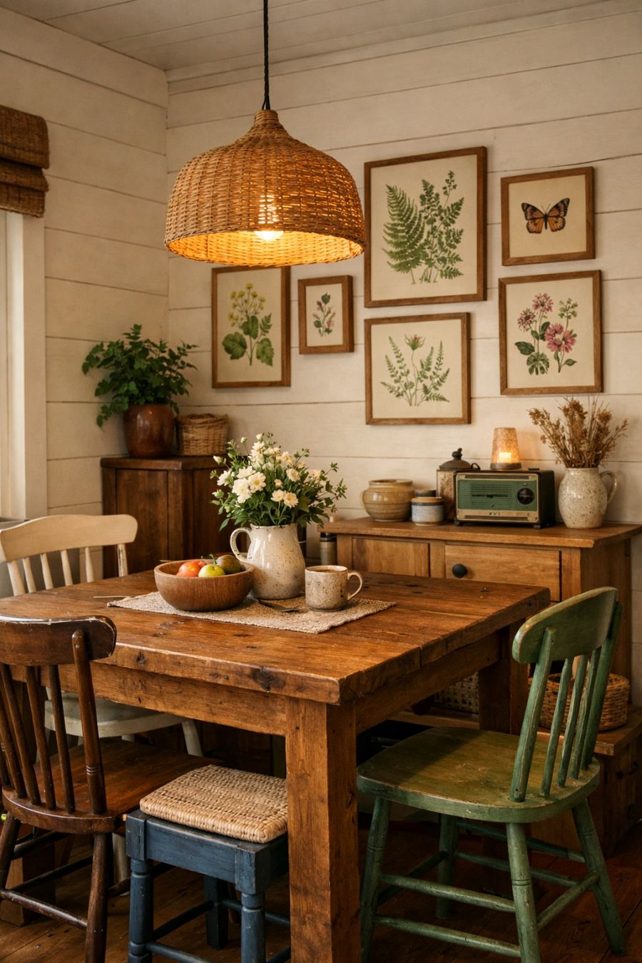 The dining area is a delightful extension of the living space, designed to foster connection and conversation. A simple, rustic wooden table serves as the centerpiece, surrounded by mismatched chairs that add a touch of whimsy. Above, a pendant light with a woven shade casts a warm glow, creating an inviting atmosphere for meals. The walls are adorned with botanical prints that echo the natural beauty outside, while a small sideboard offers additional storage and display space for cherished items.