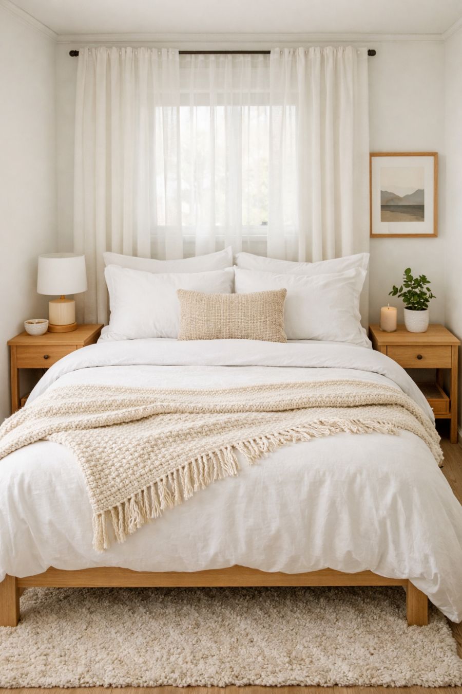 The bedroom is a serene sanctuary, designed to promote rest and relaxation. A comfortable bed with crisp white linens takes center stage, flanked by minimalist nightstands that keep the space uncluttered. Soft textiles, such as a woven throw and plush rug, add layers of texture and warmth. Natural light filters through sheer curtains, creating a gentle, calming atmosphere. Subtle touches of decor, like a small potted plant and a framed print, reflect the home's overall aesthetic of simplicity and elegance.
