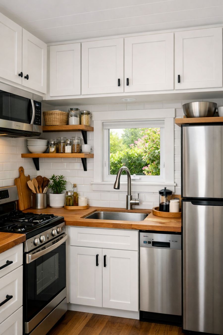 In the kitchen, functionality meets elegance with a design that maximizes space and efficiency. Crisp white cabinetry pairs beautifully with wooden countertops, creating a seamless blend of materials. Open shelving provides easy access to everyday essentials, while stainless steel appliances add a modern touch. The thoughtful layout ensures that everything is within reach, making meal preparation a pleasure rather than a chore. A small window above the sink frames a view of the garden, bringing a sense of tranquility to the heart of the home.