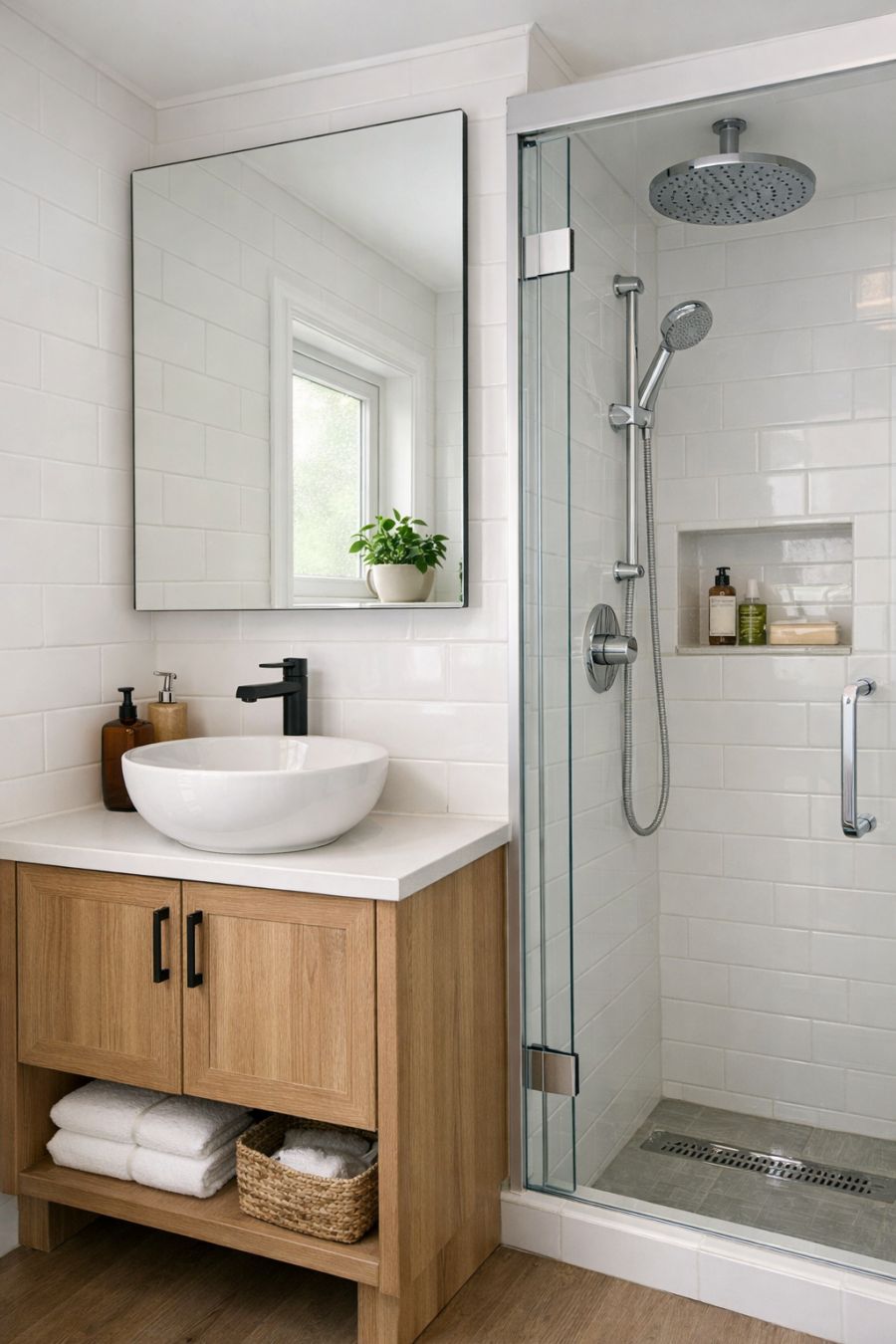 The bathroom in this tiny home is a study in efficiency and elegance. The walls are clad in crisp white tiles, creating a clean and modern backdrop for the space. A compact, yet stylish vanity with a vessel sink offers storage beneath, while an oversized mirror enhances the sense of space. The shower features glass doors and a rainfall showerhead, providing a luxurious experience within the small footprint. Subtle touches of greenery, such as a small potted plant on the windowsill, bring a hint of the outdoors into this serene space.