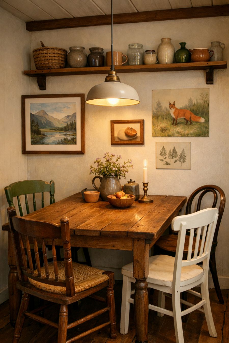 The dining area is a seamless extension of the living space, featuring a charming wooden table that comfortably seats four. The table is paired with mismatched chairs, each with its own unique character, adding a touch of whimsy to the room. Overhead, a simple yet elegant pendant light casts a warm glow, enhancing the intimate atmosphere. The walls are adorned with nature-inspired artwork, and a small shelf displays an assortment of handcrafted pottery and glassware, adding personal touches that make the space feel lived-in and welcoming.