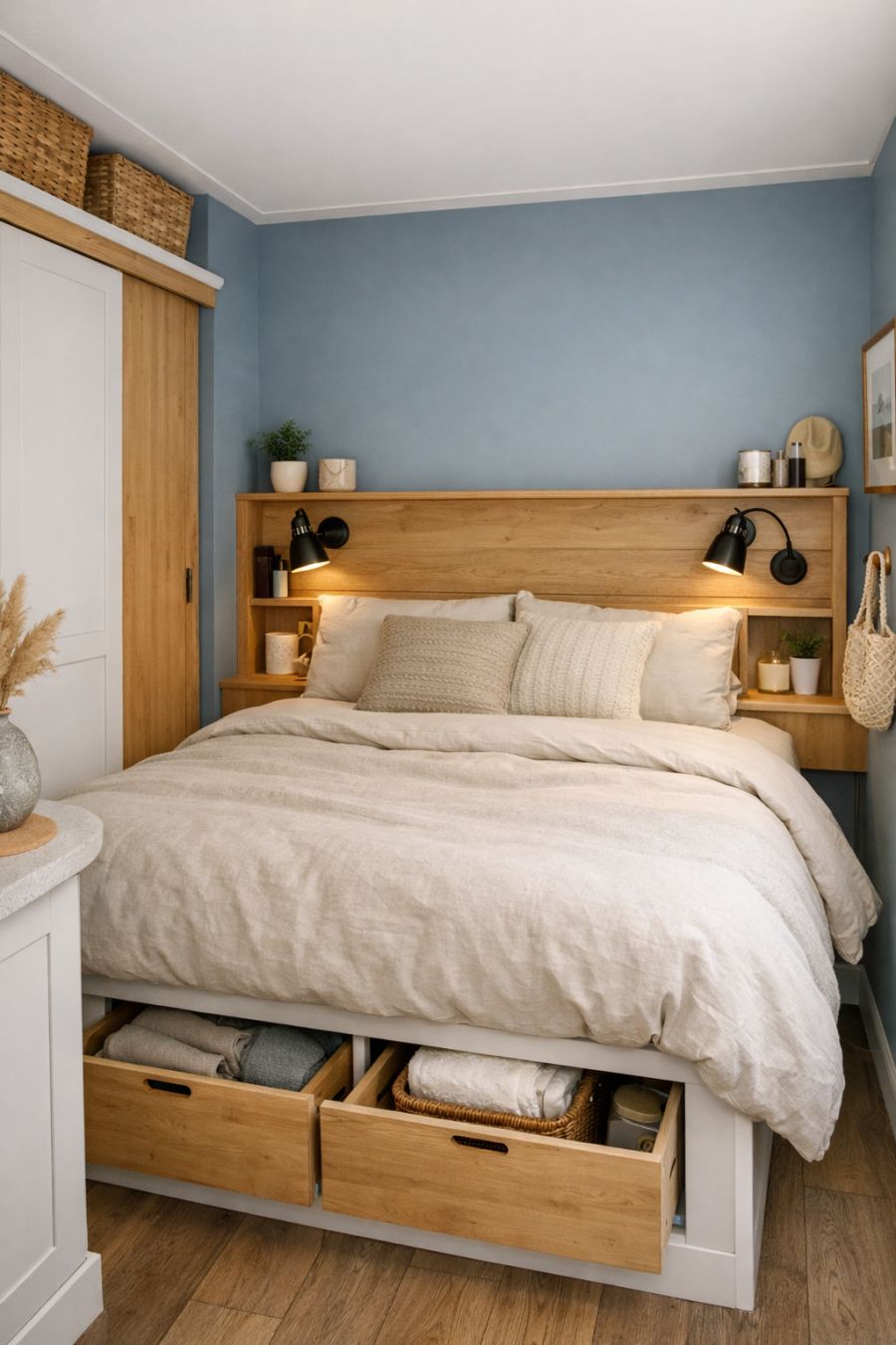 The bedroom is a serene oasis, designed to maximize comfort in a minimal space. A queen-sized bed with a soft, neutral-toned duvet invites restful slumber, while a built-in headboard provides both style and functionality with its integrated reading lights and small shelves. The walls are painted in a calming shade of blue-gray, evoking a sense of peace and tranquility. Clever storage solutions, such as under-bed drawers and a compact wardrobe, keep the space organized without sacrificing style.