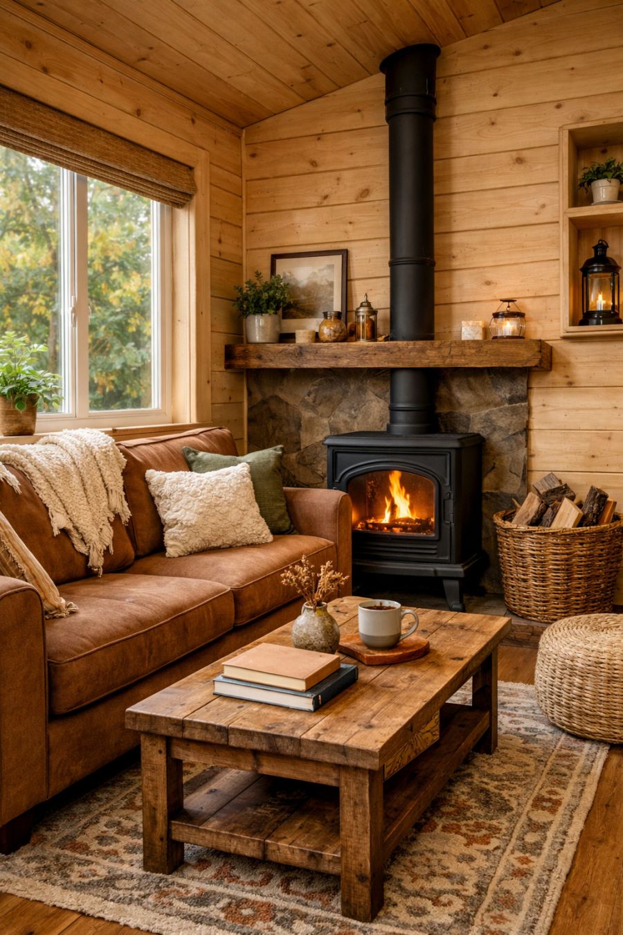 Stepping inside, the living area immediately envelops you in warmth and comfort. The walls are adorned with light wood paneling, creating a cozy cabin ambiance, while the high ceilings add a sense of spaciousness despite the cottage's compact size. A plush, earth-toned sofa faces a small, vintage-style fireplace, perfect for curling up with a good book on a chilly evening. Natural light streams in through large, strategically placed windows, highlighting the carefully curated decor that blends rustic elements with modern design.