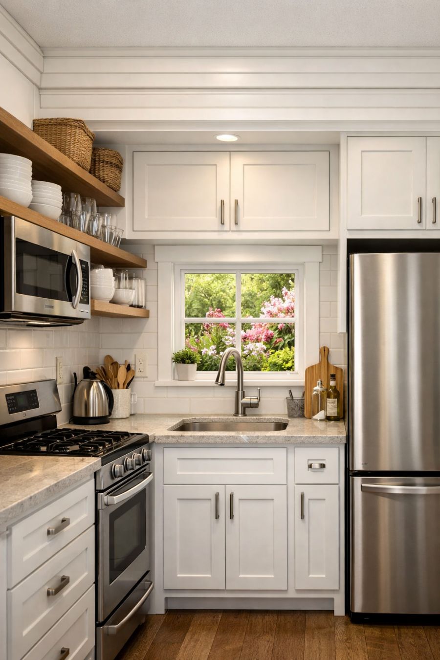 The kitchen, though compact, is a marvel of efficiency and style. White cabinetry with simple, clean lines provides ample storage, while open shelving displays neatly organized dishes and glassware. The countertops are made of a polished, light-colored stone that reflects the natural light, making the space feel bright and airy. Modern appliances in stainless steel offer all the conveniences of a full-sized kitchen, and a charming window above the sink provides a view of the blooming garden outside, bringing the beauty of nature indoors.