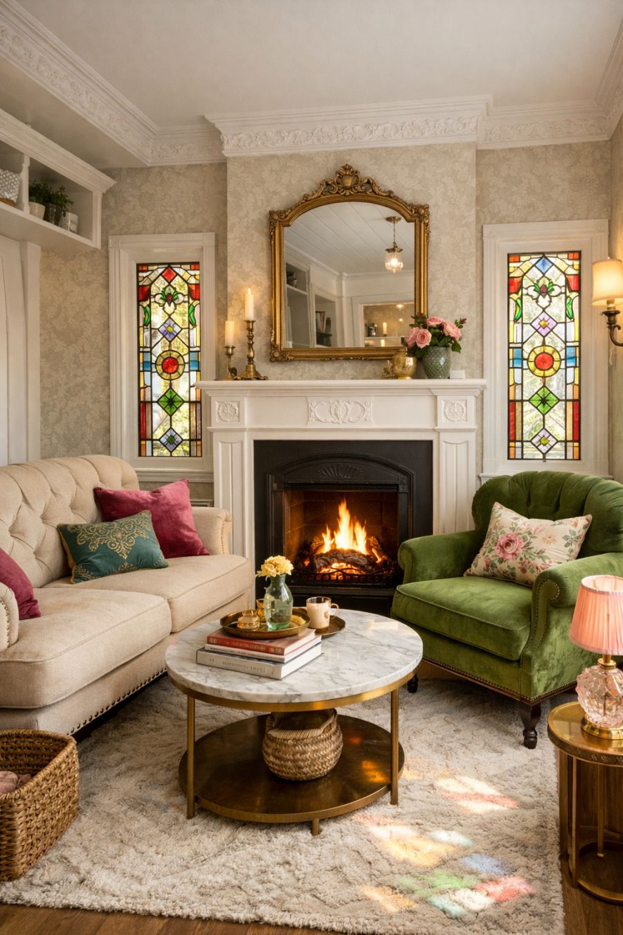 Upon entering, the living area welcomes you with its high ceilings and abundance of natural light, streaming in through the stained glass windows that cast colorful patterns across the room. The interior design is a harmonious blend of Victorian elegance and modern minimalism, featuring plush, vintage-inspired seating and a soft, neutral color palette punctuated by vibrant accents. Ornate moldings and delicate wallpaper add to the sophisticated ambiance, while a cozy fireplace becomes the room's focal point, offering warmth and comfort. This space is designed to be both inviting and functional, perfect for relaxation and socializing.