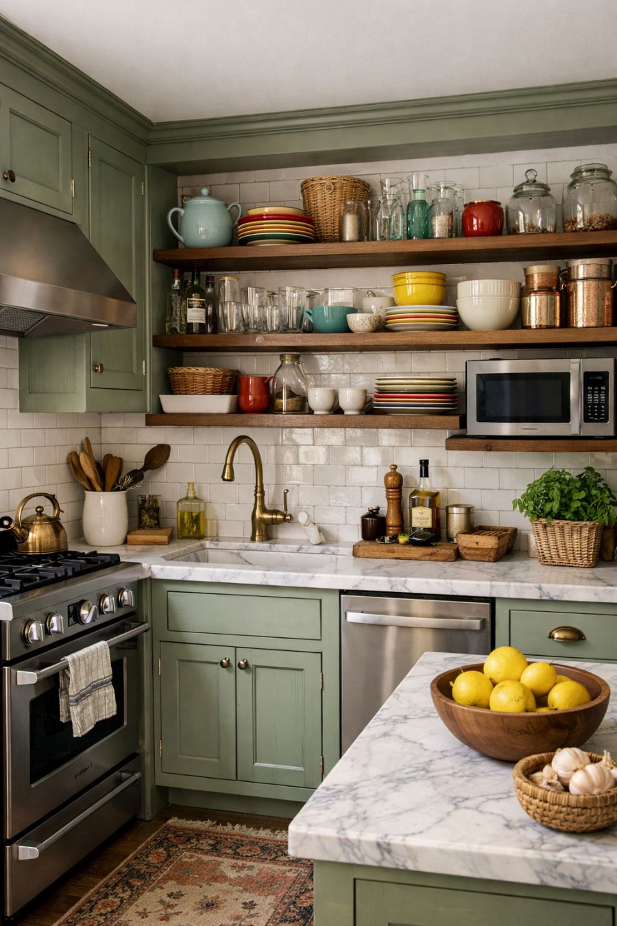 The kitchen is a delightful blend of old-world charm and modern convenience, featuring custom cabinetry painted in a soft sage green that complements the home's exterior. Carrara marble countertops provide a luxurious touch, while state-of-the-art appliances are cleverly integrated to preserve the room's vintage aesthetic. Open shelving displays an assortment of colorful dishware and glassware, adding to the kitchen's vibrant character. The space is both functional and beautiful, designed to inspire culinary creativity while maintaining a warm, welcoming ambiance.
