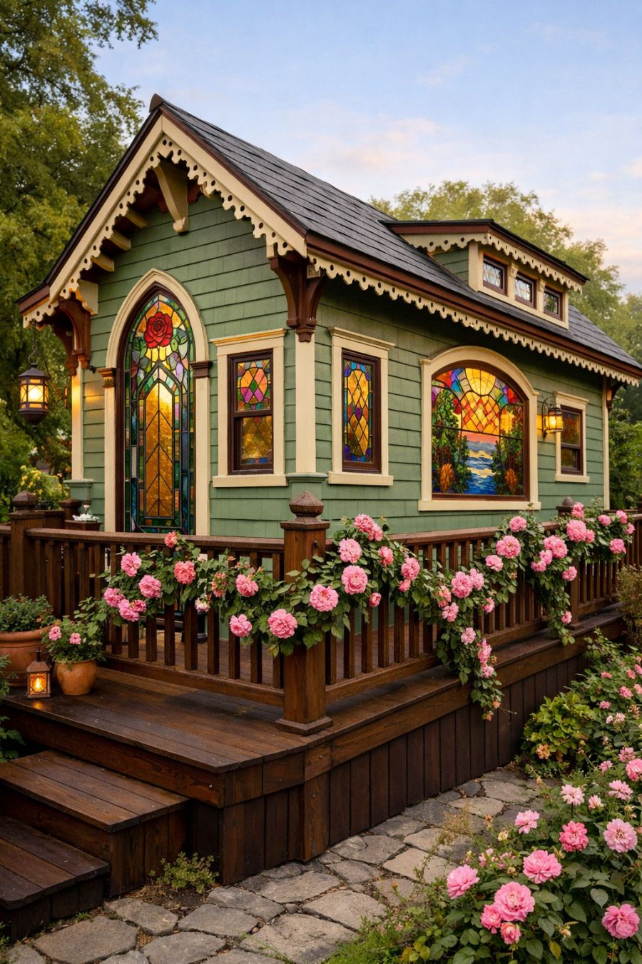 The exterior of this tiny home is a feast for the eyes, featuring ornate sage green wood lap siding that exudes classic Victorian charm. The 3/4 angled view captures the intricate details of the colorful stained glass windows, each pane telling its own story with rich hues and patterns. A dark oak wrap-around wooden deck invites you to enjoy the outdoors, enhanced by the climbing pink roses that elegantly drape along the railing, adding a touch of natural beauty. This picturesque scene is reminiscent of a fairytale cottage, inviting and full of character.