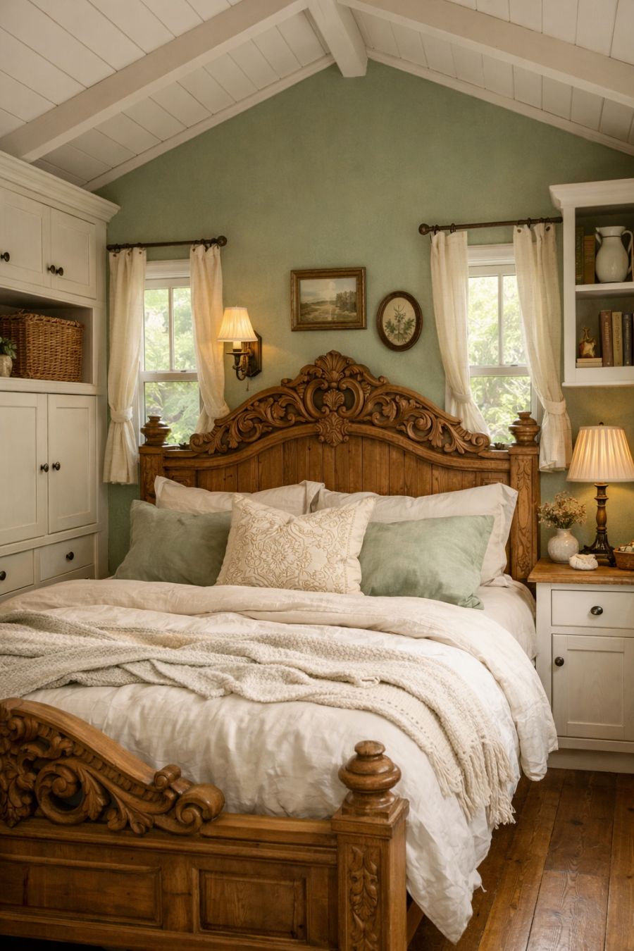 The bedroom offers a serene sanctuary, with its high ceilings and large windows that fill the room with natural light. An intricately carved wooden bed frame takes center stage, dressed in soft, luxurious linens that invite restful slumber. The sage green walls are adorned with delicate artworks and vintage accents, creating a cohesive and calming atmosphere. Built-in storage solutions maximize space without compromising on style, ensuring the room remains uncluttered and tranquil. This bedroom is a perfect blend of elegance and comfort, offering a peaceful retreat at the end of the day.