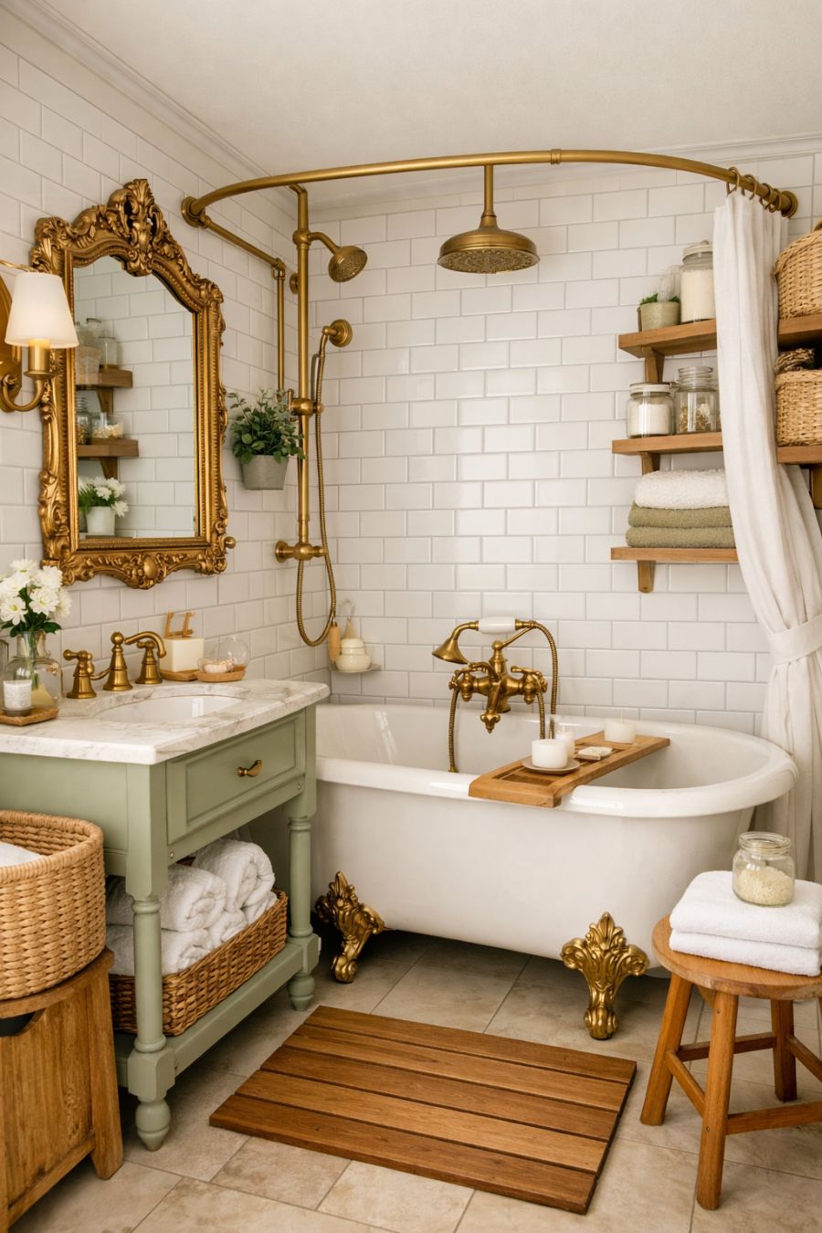 The bathroom is a masterpiece of design, featuring a classic clawfoot tub set against a backdrop of white subway tiles that create a clean, timeless look. Brass fixtures add a touch of vintage charm, while a large, ornate mirror reflects light and enhances the room's spacious feel. The color scheme is a soothing blend of whites and soft greens, accented by natural wooden elements that add warmth. Clever storage solutions ensure the space remains functional, while details like a vintage-style vanity and elegant lighting complete the luxurious atmosphere of this bathroom.
