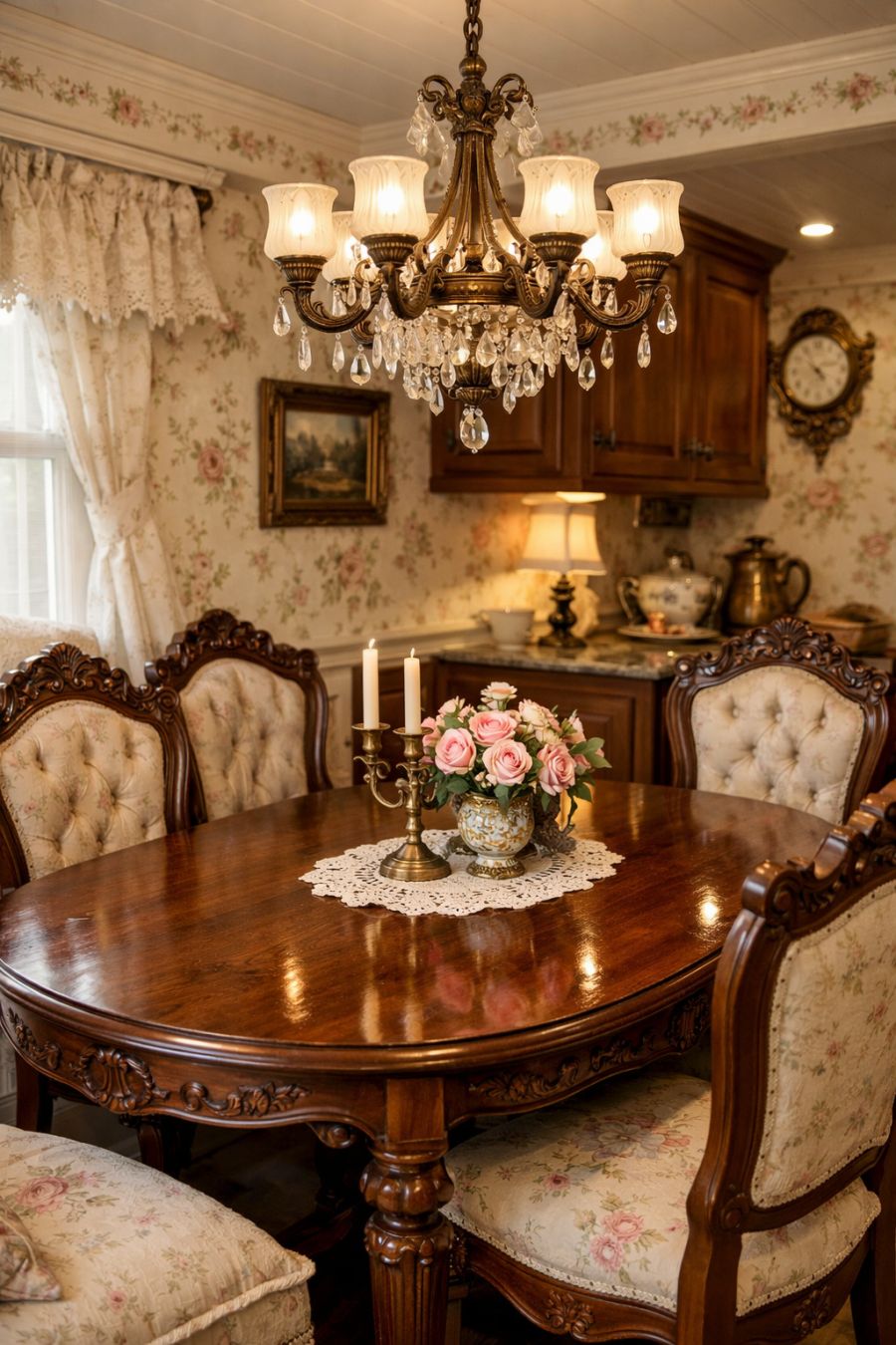 The dining area seamlessly integrates with the living space, maintaining the home's elegant Victorian theme. A classic wooden table, polished to perfection, is surrounded by intricately carved chairs that echo the home's ornate theme. Above, a vintage-inspired chandelier casts a warm glow, creating an intimate and inviting atmosphere for meals. The walls are adorned with delicate floral patterns, enhancing the garden-like feel of the home. This dining space is crafted for both everyday dining and special occasions, providing a charming setting for any gathering.