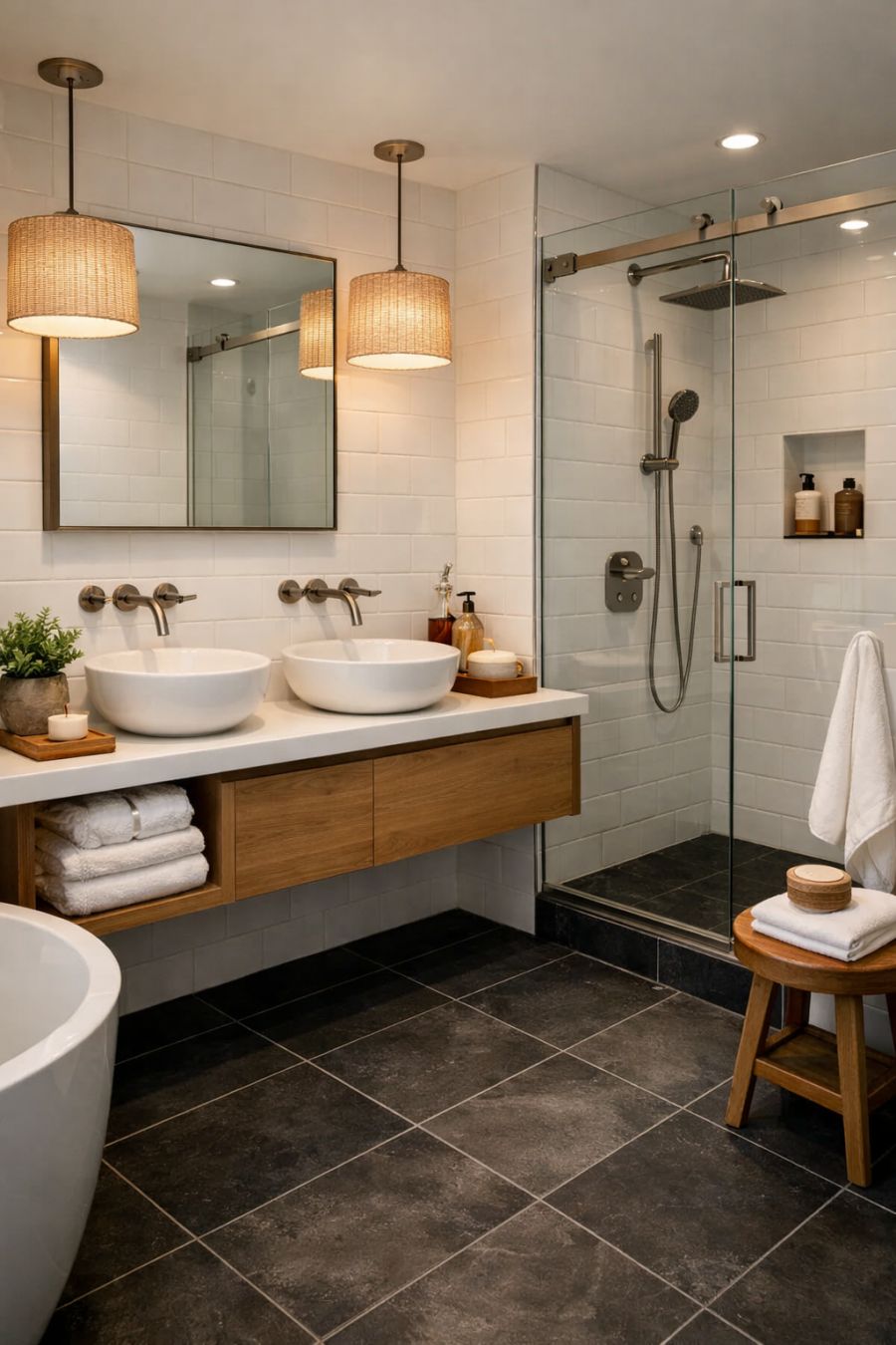 The bathroom is a testament to the fusion of style and functionality. Crisp white tiles line the walls, contrasting with the dark, slate flooring that exudes sophistication. A floating vanity with vessel sinks offers modern elegance, while the frameless glass shower enclosure adds a touch of luxe. The room's layout is designed for efficiency and comfort, with fixtures that combine sleek design with practicality. Soft lighting and carefully selected accessories enhance the tranquil ambiance, making it a perfect place for unwinding and rejuvenation.