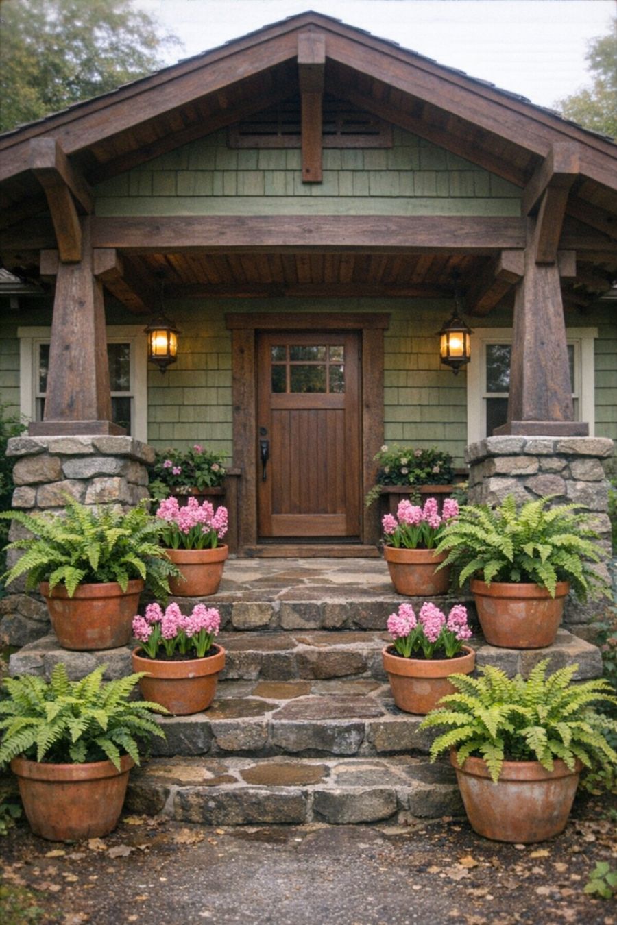 The exterior of this Craftsman cottage is a study in rustic charm, with its olive green wood siding exuding a sense of tranquility and natural harmony. Thick, tapered column posts support a welcoming stone porch, inviting visitors to pause and enjoy the serene surroundings. Exposed wood rafter tails add an authentic touch, hinting at the craftsmanship of a bygone era. Terra cotta pots brimming with ferns and vibrant pink hyacinths adorn the steps, creating a picturesque scene reminiscent of an impressionist painting, all captured in an amateur photograph that adds a layer of intimacy and warmth.
