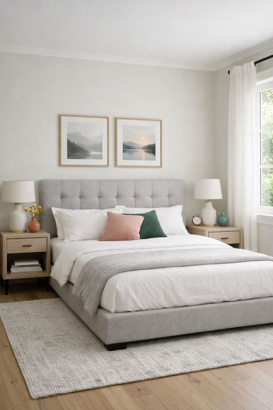 The bedroom is a serene retreat, with clean lines and a minimalist approach that emphasizes comfort and relaxation. A platform bed with a tufted headboard takes center stage, flanked by sleek nightstands that provide practical storage. The color palette is muted, with soft grays and whites creating a soothing backdrop, while strategically placed splashes of color add personality. Large windows invite natural light to flood the space, highlighting the room's understated elegance and making it a perfect sanctuary from the hustle and bustle of daily life.