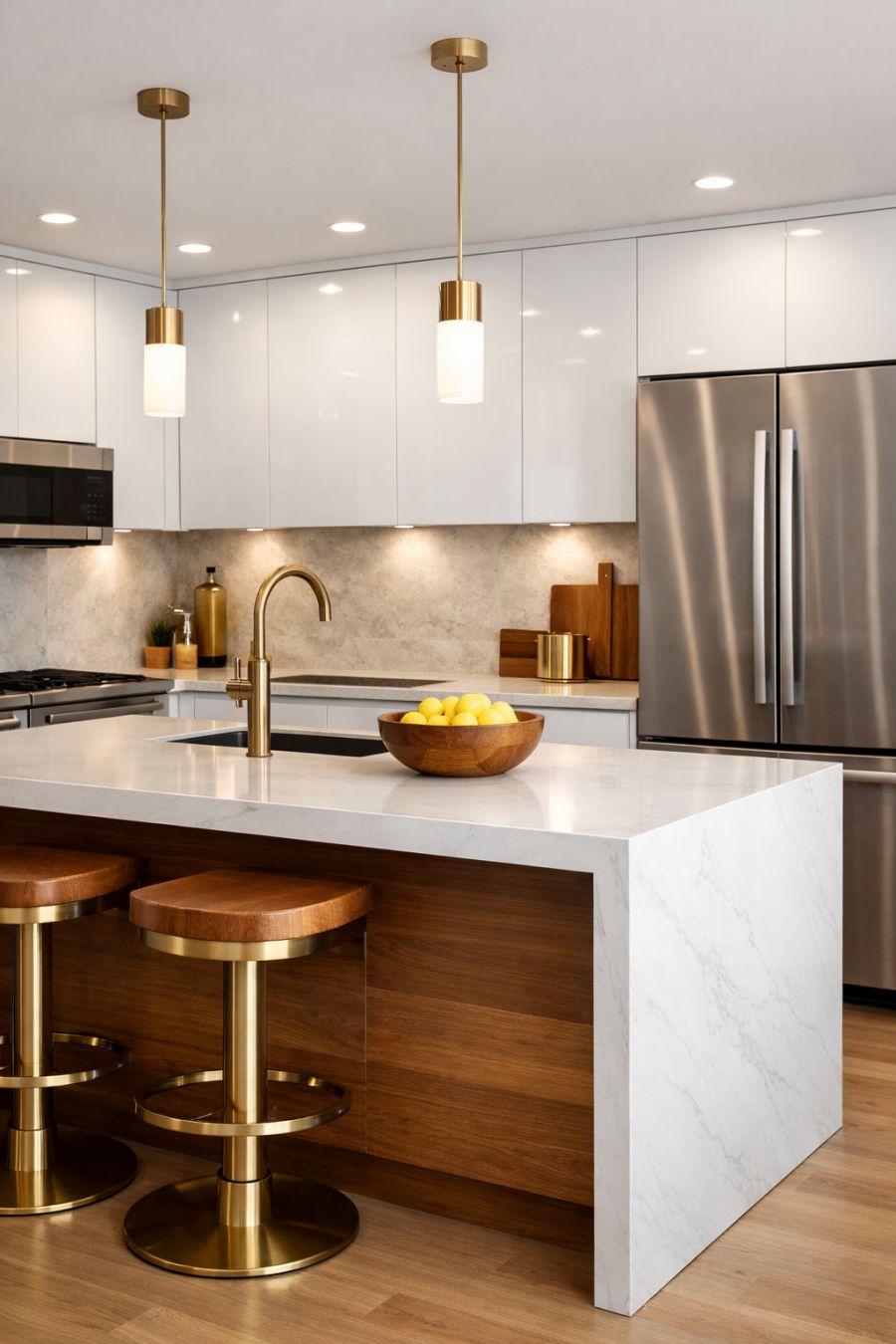 In the kitchen, the futuristic secret of this home truly shines. Sleek, handleless cabinetry in a glossy white finish reflects light, making the space feel expansive and bright. Stainless steel appliances, integrated seamlessly into the design, offer state-of-the-art functionality that complements the home's aesthetic. A large island with a waterfall countertop provides ample space for both meal preparation and casual dining. The room is accented with touches of brass and wood, adding warmth and texture to the modern, streamlined environment.