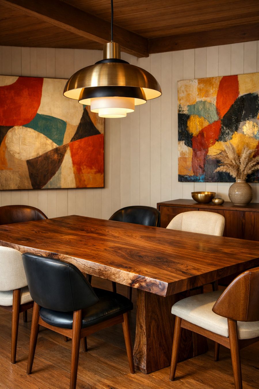 The dining area continues the theme of mid-century elegance with a bold table crafted from a single piece of richly grained wood. Surrounding it are chairs with curved backs and tapered legs, offering both comfort and style. A statement pendant light overhead, with its geometric shapes and metallic finishes, casts a warm glow, enhancing the room's inviting ambiance. The walls are adorned with abstract art pieces that echo the vibrant color scheme, tying the space together in a harmonious blend of old and new.