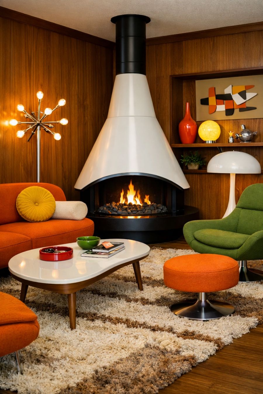 Step inside, and you're greeted by a living area that feels like a time capsule from the mid-century space age. The sleek lines of the furniture, with their low profiles and organic shapes, are reminiscent of the 1960s, yet they maintain an unmistakably modern appeal. A palette of warm earth tones, punctuated by bright pops of color, creates an inviting atmosphere that feels both retro and fresh. The room's focal point is a minimalist fireplace with a futuristic design, providing a cozy gathering spot without overwhelming the space.