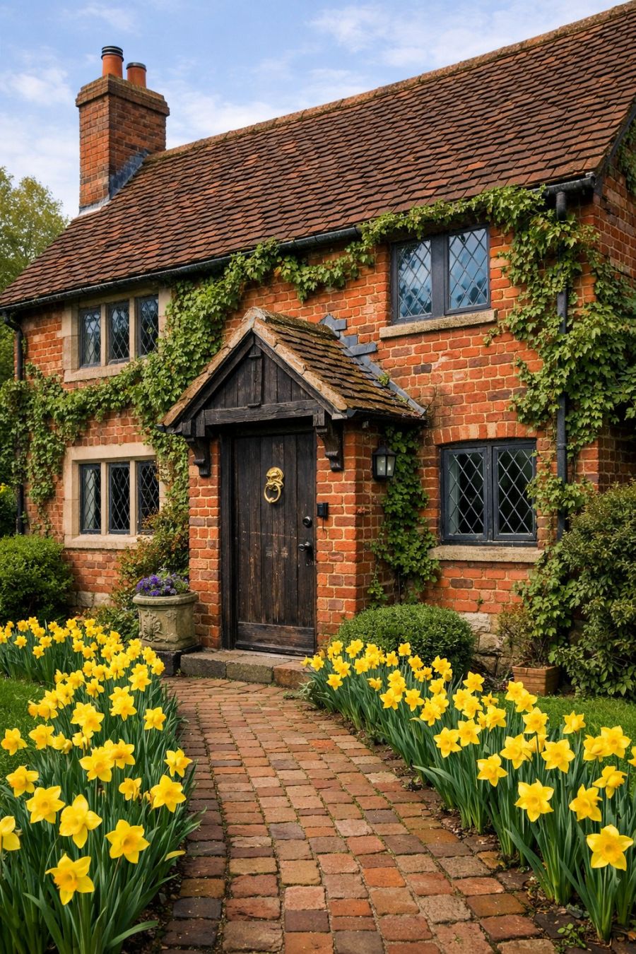 The exterior of this charming abode is a tribute to the classic English cottage, with its red brick facade exuding a timeless appeal. Climbing green ivy weaves its way up the walls, adding a touch of nature's artistry to the structured beauty of the brickwork. The distressed dark wood door, complete with a brass knocker, offers a welcoming yet mysterious entrance, hinting at the stories that lie within. Early blooming yellow daffodils line the brick walkway, providing a cheerful contrast against the earthy tones and inviting guests to step closer and discover the surprises that await inside.