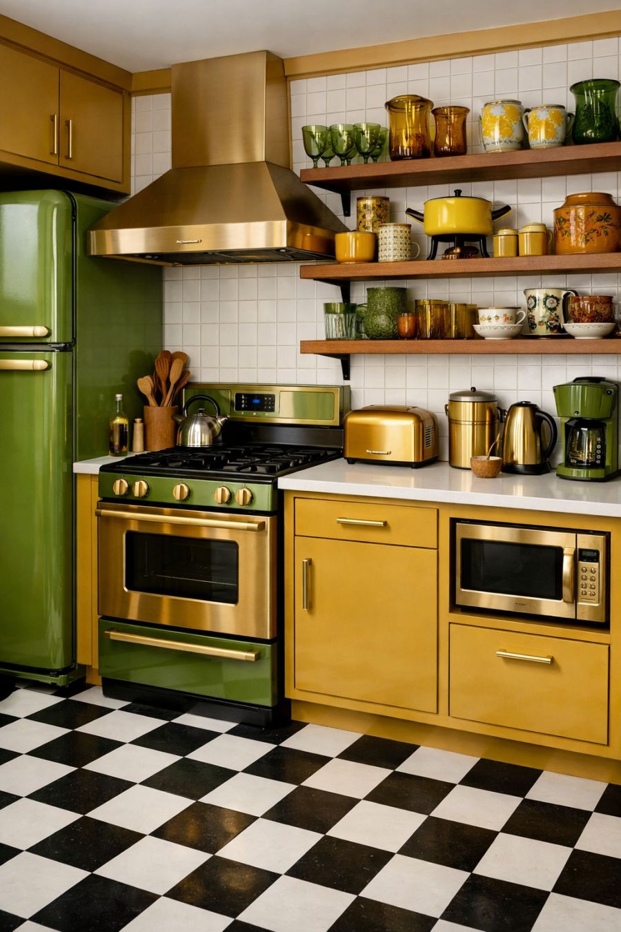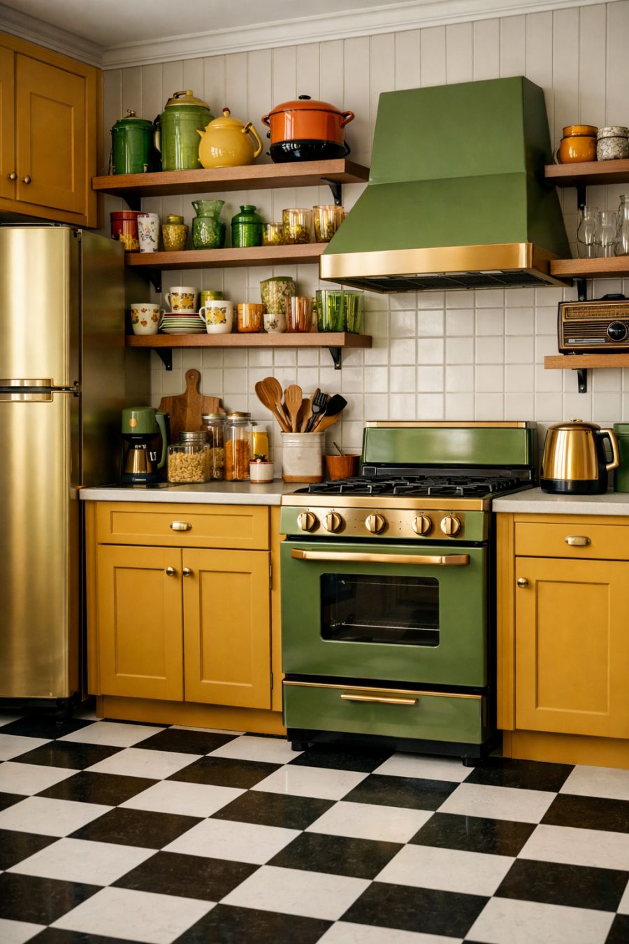 In the kitchen, the 1970s aesthetic is given a modern twist, blending functionality with flair. Sleek, retro-style appliances in brushed gold and avocado green nod to the past while offering contemporary performance. The cabinetry, painted in a rich mustard hue, provides ample storage and a playful pop of color. Checkerboard tiles in black and white cover the floor, adding a classic touch that ties the eclectic design together. Open shelving displays an array of vintage glassware and ceramics, making the kitchen both a practical workspace and a visual delight.
