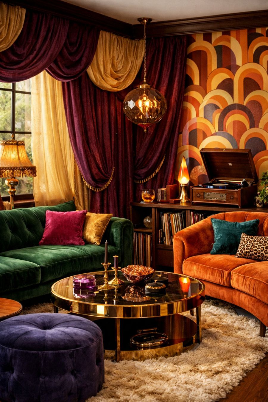 Upon entering, visitors are greeted with a living area that defies the expectations set by the cottage’s exterior. The space is a vibrant homage to 1970s velvet glam, featuring plush, jewel-toned sofas that invite relaxation and conversation. Dramatic drapery cascades from the ceiling, framing large windows that allow natural light to dance across the room. The walls are adorned with bold, geometric patterns that echo the era’s fascination with color and form. A vintage record player sits in the corner, completing the retro vibe and offering a soundtrack to this stylish sanctuary.
