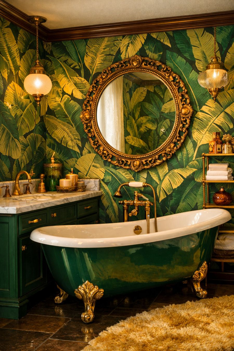 The bathroom is a study in 1970s decadence, with a color palette that delights the senses. Bold, leafy wallpaper in shades of emerald and gold creates an invigorating atmosphere, while brass fixtures add a touch of luxury and warmth. The centerpiece is a free-standing, clawfoot bathtub, inviting long soaks amidst the opulence. A large, round mirror with an ornate frame hangs above the marble-topped vanity, reflecting the room's vibrant energy and enhancing the sense of space. The layout is both stylish and functional, ensuring that every visit feels like a mini escape.