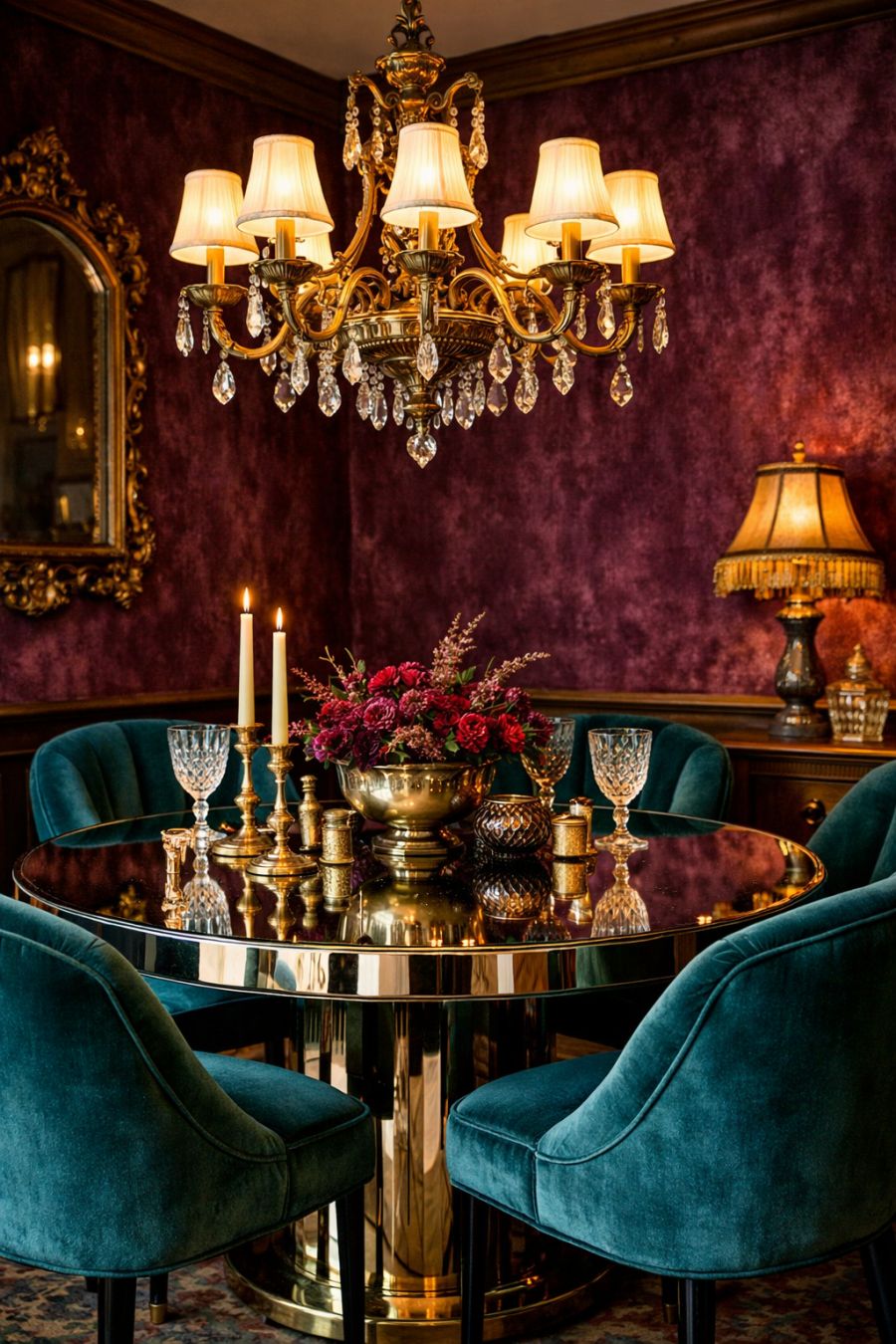 The dining area continues the thrilling journey through time, with a table set that feels both nostalgic and avant-garde. The centerpiece is a round, mirrored dining table that reflects the room's vibrant hues, surrounded by luxurious velvet chairs in deep teal. Above, an ornate chandelier with a brass finish casts a warm, inviting glow, enhancing the room's rich textures. Walls adorned with velvet wallpaper in a deep, saturated plum add depth and drama, creating a space that is as much about savoring ambiance as it is about enjoying a meal.