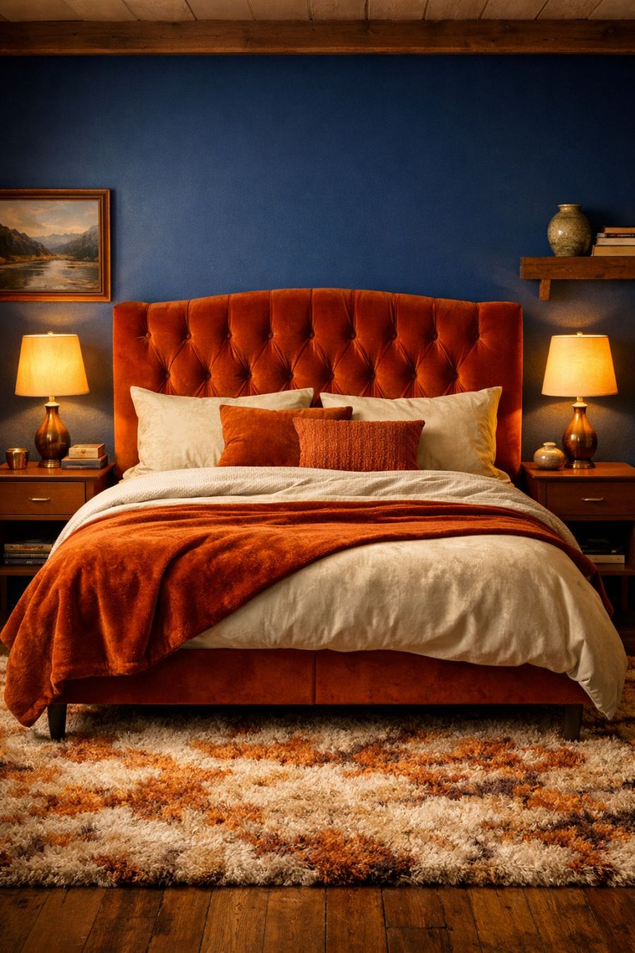 The bedroom offers a serene retreat, enveloping inhabitants in a cocoon of velvet and warmth. Walls are painted in a soothing, deep sapphire blue, creating a calming backdrop for the room's focal point: a sumptuous king-sized bed with a plush velvet headboard in burnt orange. A shag rug in complementary tones covers the wooden floor, providing a soft landing and enhancing the room's cozy atmosphere. Mid-century modern nightstands flank the bed, topped with retro lamps that cast a gentle glow, perfect for late-night reading or relaxation.