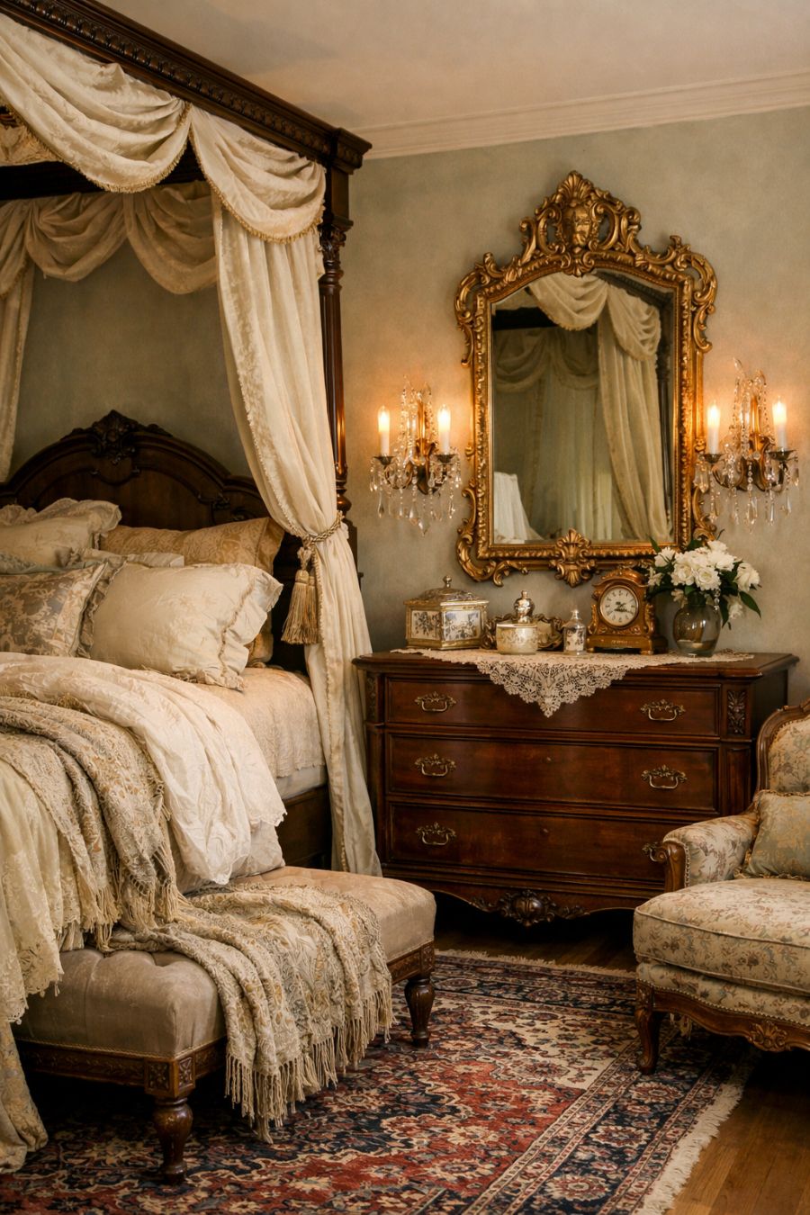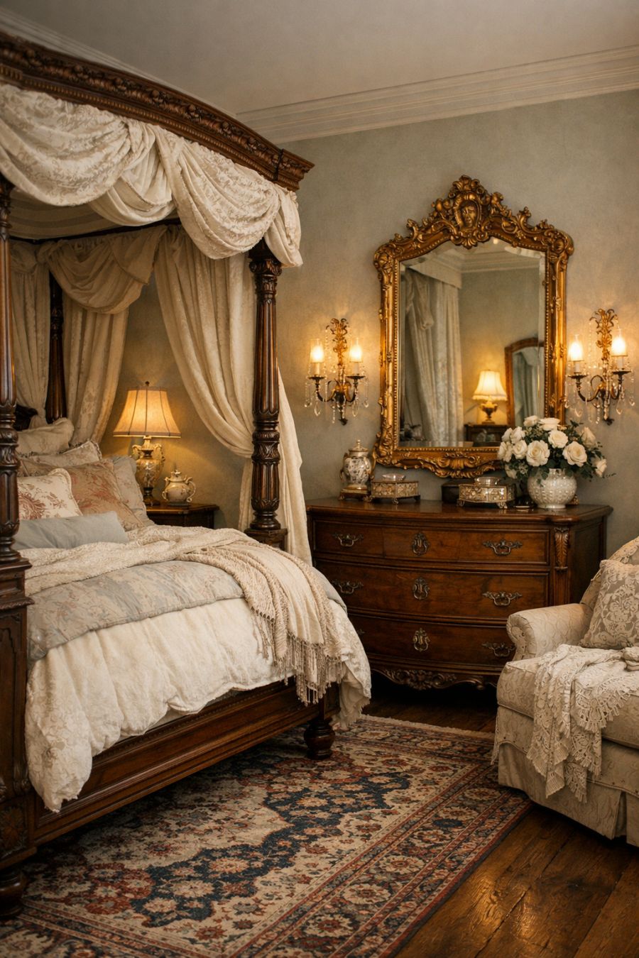 The bedroom is a sanctuary of tranquility and elegance, featuring a grand, four-poster bed draped in sumptuous fabrics. The walls, painted in a soft, muted palette, provide a serene backdrop for the ornate Victorian furniture that fills the space. A gilded mirror hangs above an antique dresser, reflecting the soft light from a pair of crystal wall sconces. Plush, layered textiles and a vintage Persian rug underfoot add warmth and texture, creating a room that invites relaxation and repose.