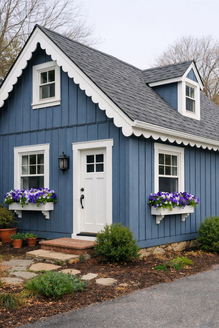 The exterior of this slate blue board and batten Cape Cod cottage exudes a timeless appeal. A distinctive white scalloped fascia board adds a touch of whimsy, framing the roofline with delicate curves. Window boxes brimming with early spring purple pansies create a cheerful pop of color against the serene blue backdrop. Captured from a 3/4 angled view, this amateur photograph highlights the cottage's quaint charm, inviting passersby to imagine the world beyond its front door.