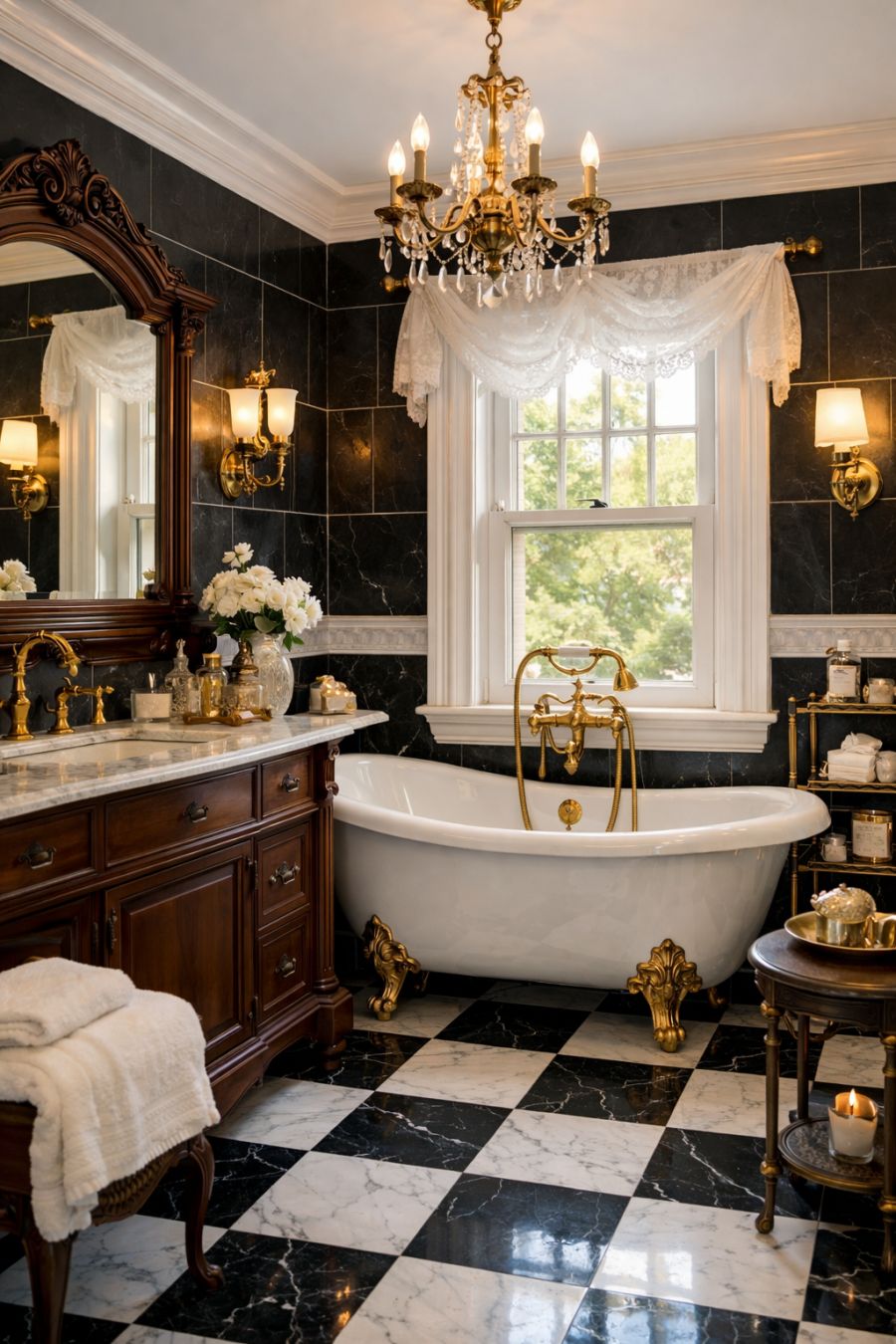 The bathroom is a testament to Victorian luxury, where functionality meets style in a harmonious blend. The space is adorned with classic black and white marble tiles, creating a timeless and elegant atmosphere. A clawfoot tub sits majestically beneath a window, offering a peaceful retreat for soaking in natural light. Elegant fixtures in polished brass add a touch of warmth and sophistication, while an antique vanity with a marble countertop provides ample space for daily routines. The overall layout is spacious and well-organized, ensuring both comfort and convenience.
