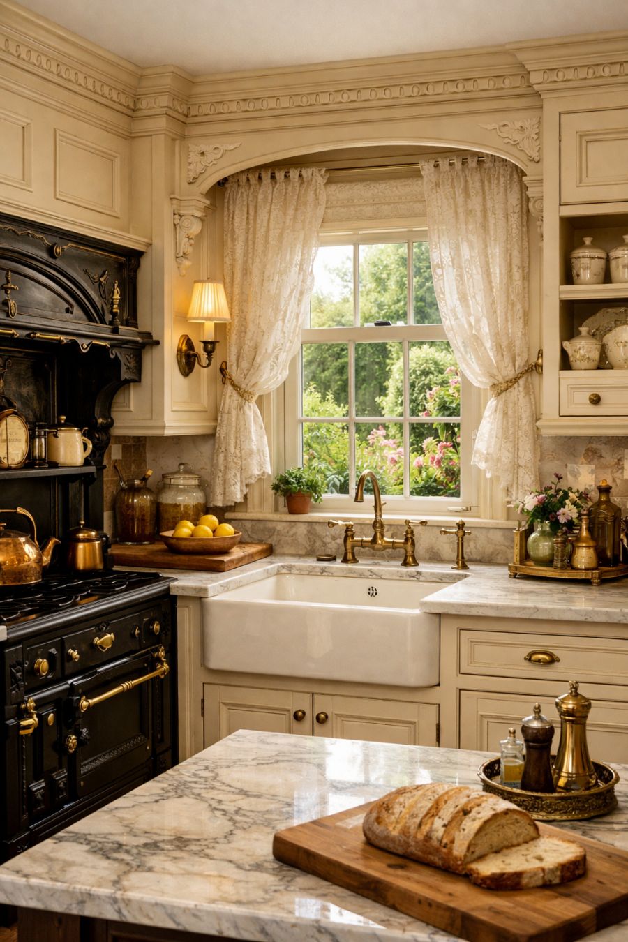 In the kitchen, the Victorian aesthetic is married with modern functionality. Custom cabinetry, painted in a rich cream, is accented with brass hardware and intricate moldings. A large, farmhouse-style sink sits beneath a window that offers a view of the lush garden outside. The countertops are made of polished marble, providing a luxurious surface for meal preparation. An antique, cast iron stove serves as both a focal point and a nod to the home's historical influences, blending seamlessly with the contemporary appliances hidden within the cabinetry.