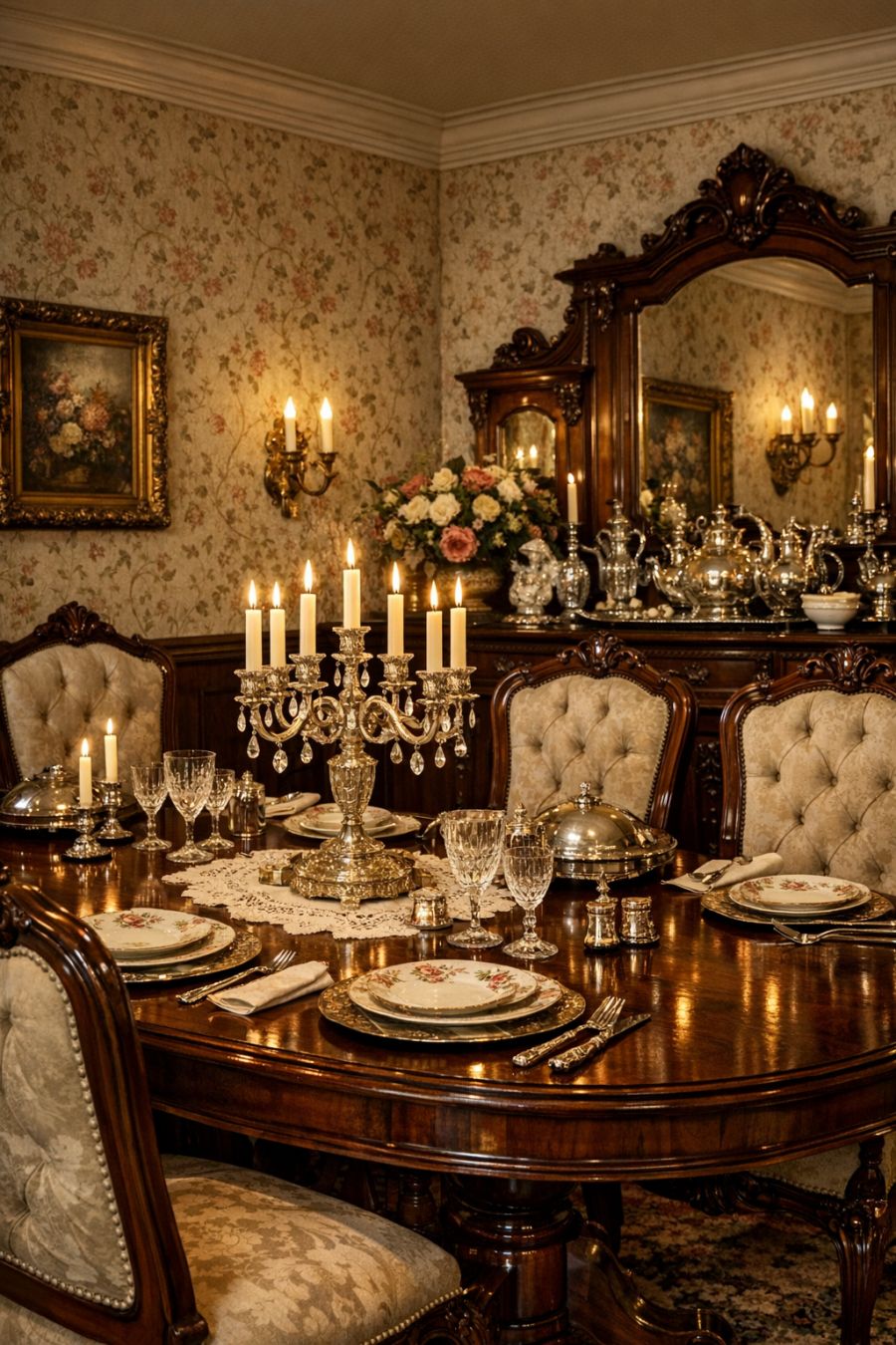 The dining area continues the theme of Victorian opulence with a majestic mahogany dining table as its centerpiece. Surrounded by high-backed, upholstered chairs, the table is set beneath an elaborate candelabra, echoing the grandeur of the living area. Walls are adorned with vintage wallpaper featuring delicate floral patterns, creating a backdrop that is both classic and elegant. An antique sideboard, laden with fine china and silverware, completes the space, making it ideal for hosting lavish dinner parties.