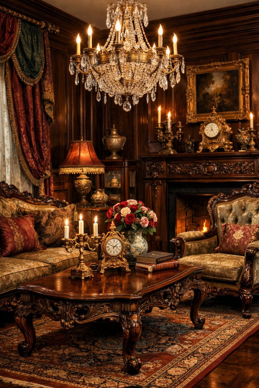 Stepping inside, the living area unveils an opulent Victorian-inspired oasis. Ornate antique furniture pieces, adorned with intricate carvings, create a sense of grandeur and elegance. Rich, jewel-toned draperies cascade from ceiling to floor, complementing the dark wood paneling that lines the walls. A grand chandelier, dripping with crystal droplets, casts a warm, inviting glow over the room, setting the tone for a space that feels both luxurious and intimate.