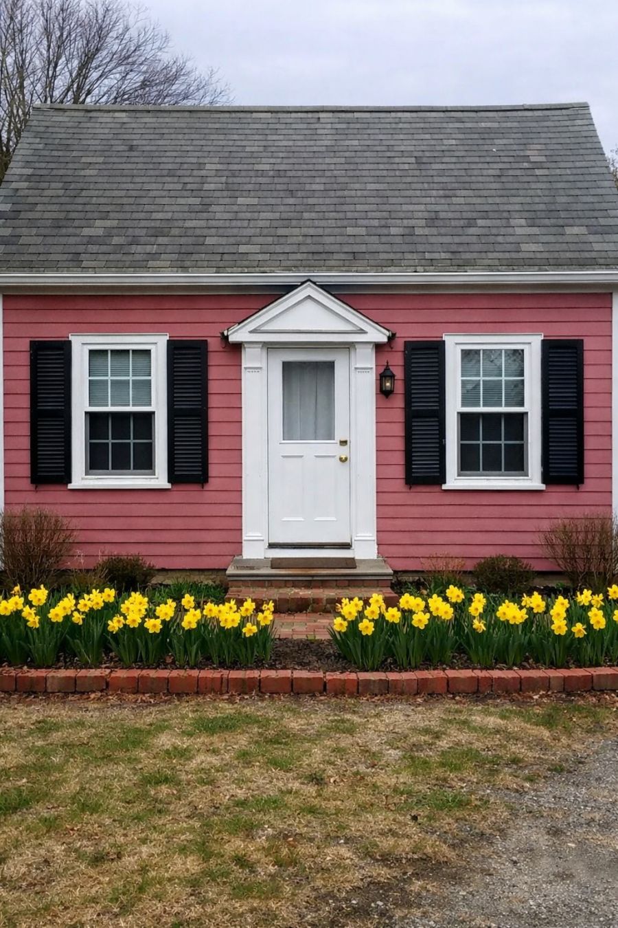 The exterior of this charming Cape Cod cottage is painted in a soothing dusty rose hue, which perfectly complements its crisp white window trims and black slatted shutters. The front-facing view, captured in amateur photography, reveals a picturesque scene with early March blooming yellow daffodils lining a neat brick border. These vibrant flowers add a cheerful pop of color to the setting, hinting at the warmth and life within. Despite its quaint appearance, the cottage exudes a timeless charm that invites you to explore further.