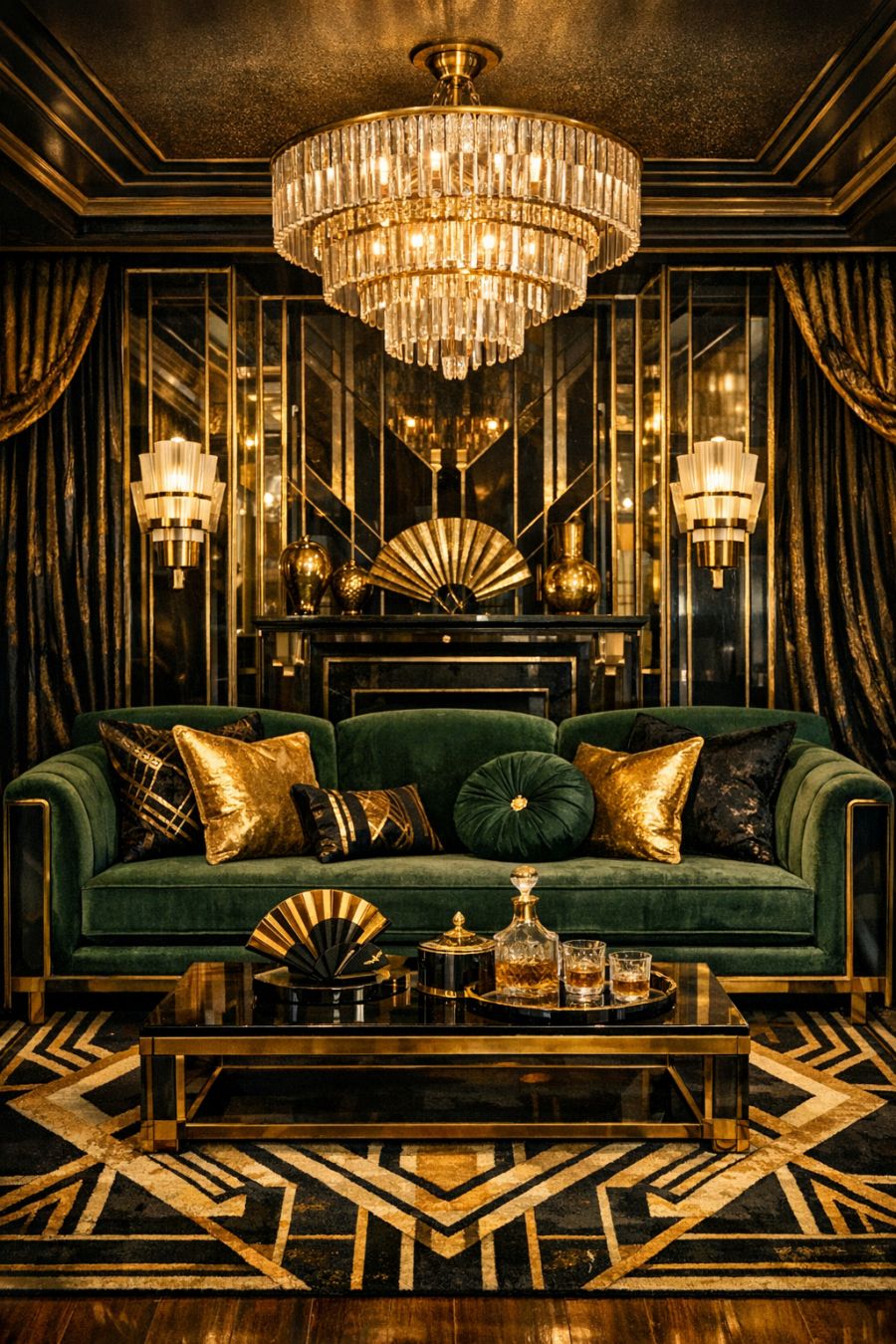 Stepping inside, you're immediately greeted by a living area that embodies the glamour of 1920s Art Deco style. The room is adorned with rich velvet drapes, geometric patterns, and a striking color palette of gold, black, and deep emerald. A plush, low-set sofa sits atop a luxurious area rug, which features bold, angular designs typical of the era. The walls are lined with mirrored panels that reflect light and create an illusion of space, adding to the opulence of the room. A statement chandelier hangs from the ceiling, casting a warm glow over the entire area.