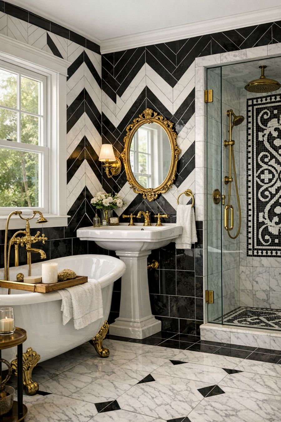 The bathroom is a sanctuary of elegance, featuring a freestanding clawfoot tub that invites leisurely soaks. The walls are clad in sleek black and white tiles, arranged in a striking chevron pattern that adds visual interest. Brass fixtures and a vintage-style pedestal sink contribute to the room's timeless appeal, while a large window allows natural light to flood the space. A glass-enclosed shower with intricate tile work offers a modern touch, blending seamlessly with the overall aesthetic. The atmosphere is one of serene luxury, where every detail is carefully considered.